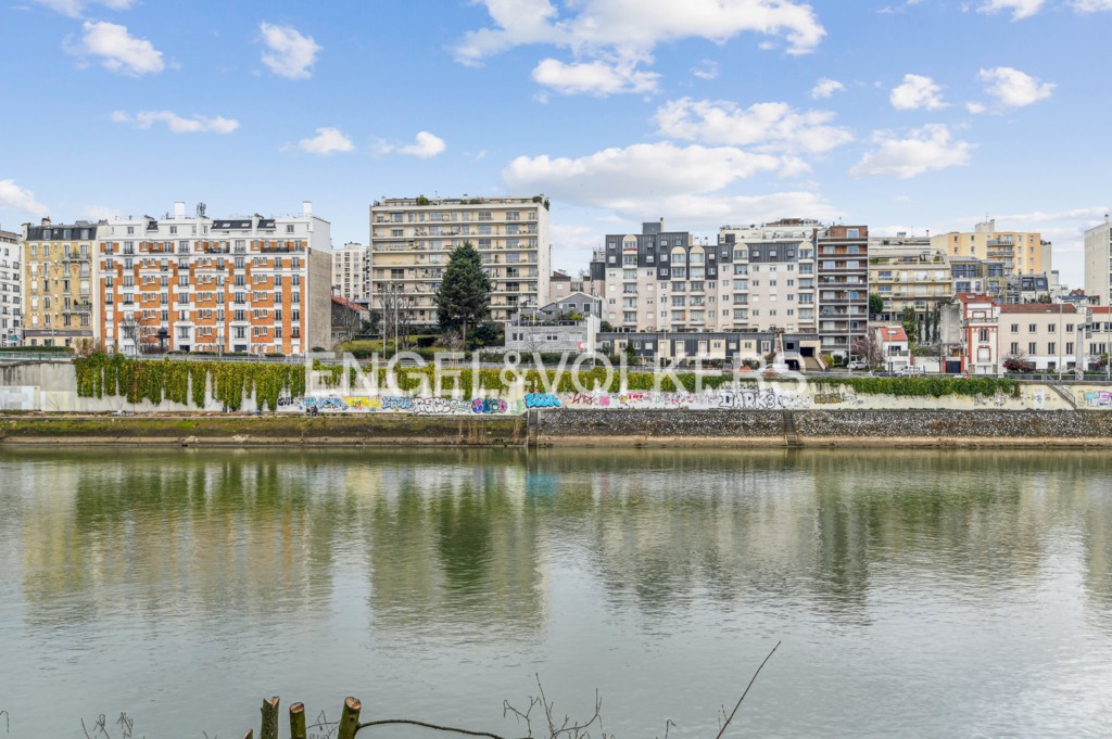 Dans le silence rare d'une rue piétonne confidentielle, au coeur de l'Île de la Jatte, cette maison aux lignes modernes s'élève discrètement face à la Seine. Sans aucun vis-à-vis, avec pour seul décor la lumière, le ciel et l'eau, cette pro...