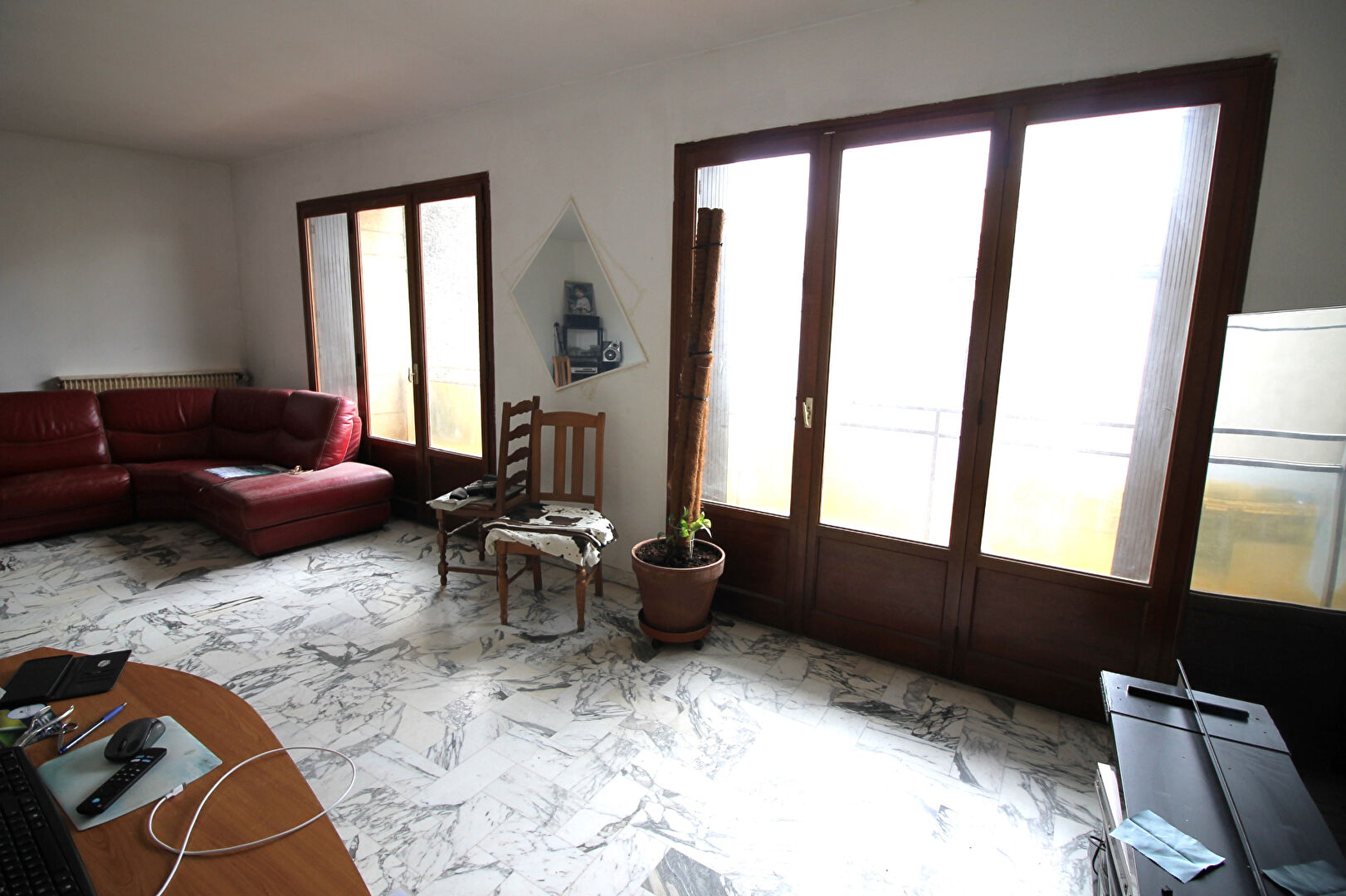 NIMES CENTRE VILLE LES CARMES grand appartement traversant de type 4 de 89m² avec 2 balcons. Hall d'entrée, cuisine, double séjour, 2 chambres, dressing, WC, SDE. Ascenseur. Cave. A rafraîchir ! Charges comprenant eau froide, eau chaude et chauffage.