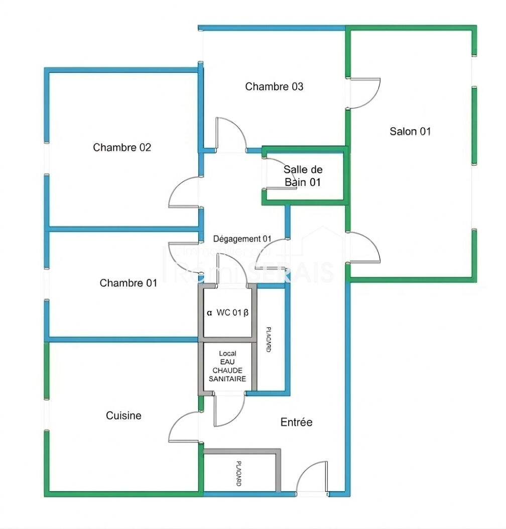 Entrée placards, cuisine aménagée ouverte sur séjour, 2 chambres, salle d'eau, wc.