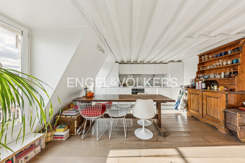 En plein coeur de L'Île de la Cité, au pied du Pont Neuf, un appartement en duplex dans un bel immeuble du XVIIe siècle.