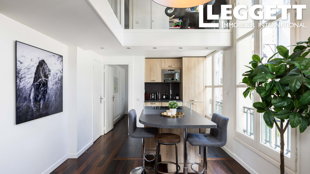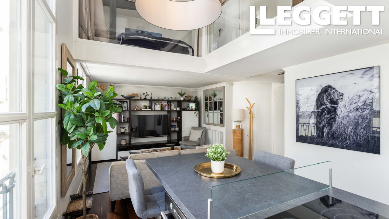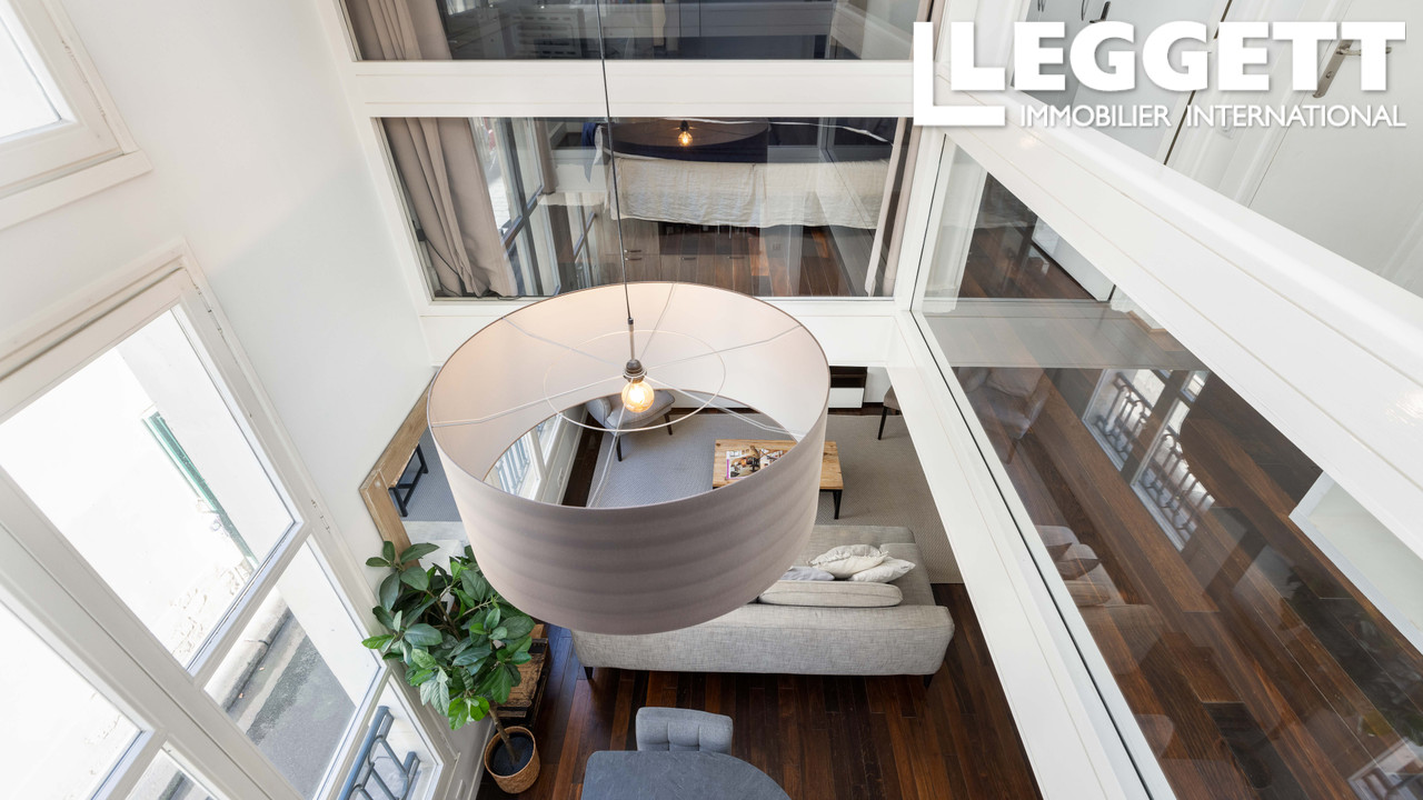 A41580HHE75 - Au coeur de l'Île Saint-Louis, sur une cour paisible, ce duplex style loft en rez-de-chaussée d'environ 80 m² a été entièrement rénové. La pièce de vie offre un volume saisissant avec 4 m de hauteur sous plafond, poutres restaurées et m...
