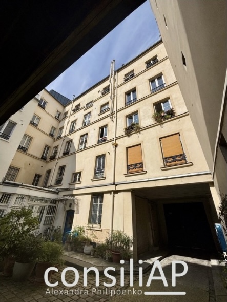 Au 1er étage étage sur cour d'un bel immeuble ancien avec ascenseur, 2 pièces se composant d'une entrée desservant un séjour, une cuisine ouverte, une chambre sur parquet ancien, une salle d'eau avec wc. Un débarras privatif sur le palier avec b...