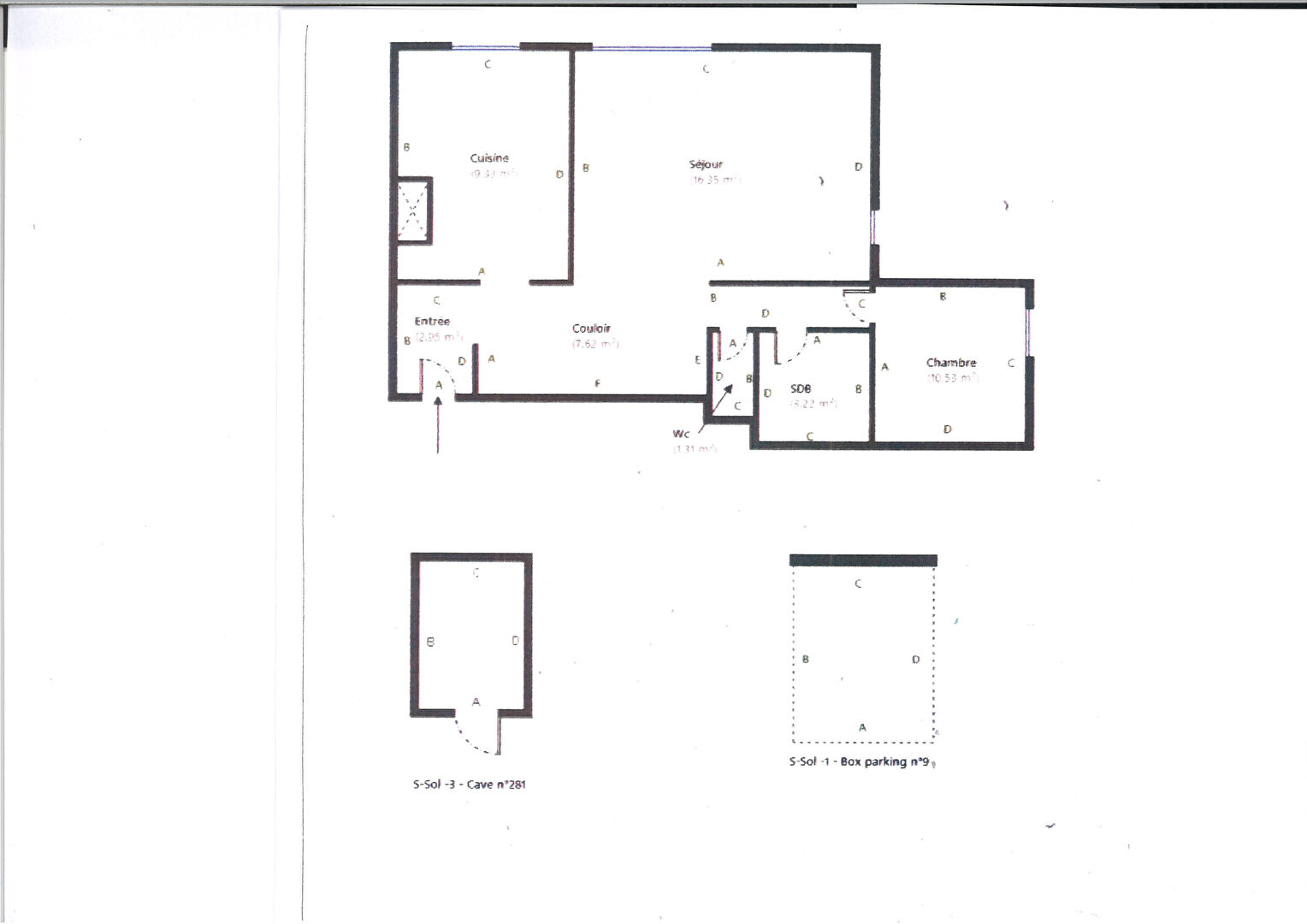 Appartement 2 pièces, entrée, salle d'eau avec WC, salon, cuisine, chambre et cave.