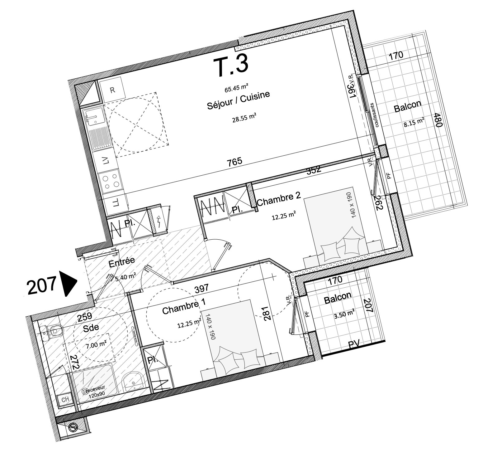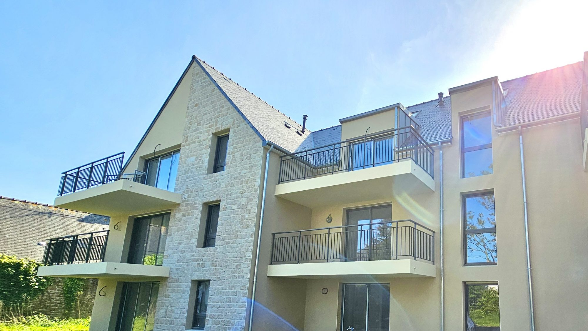 Appartement T3 de 71 m² situé au 1er étage, avec balcon de 14,65 m² offrant une vue mer sur l'Anse de Perros.