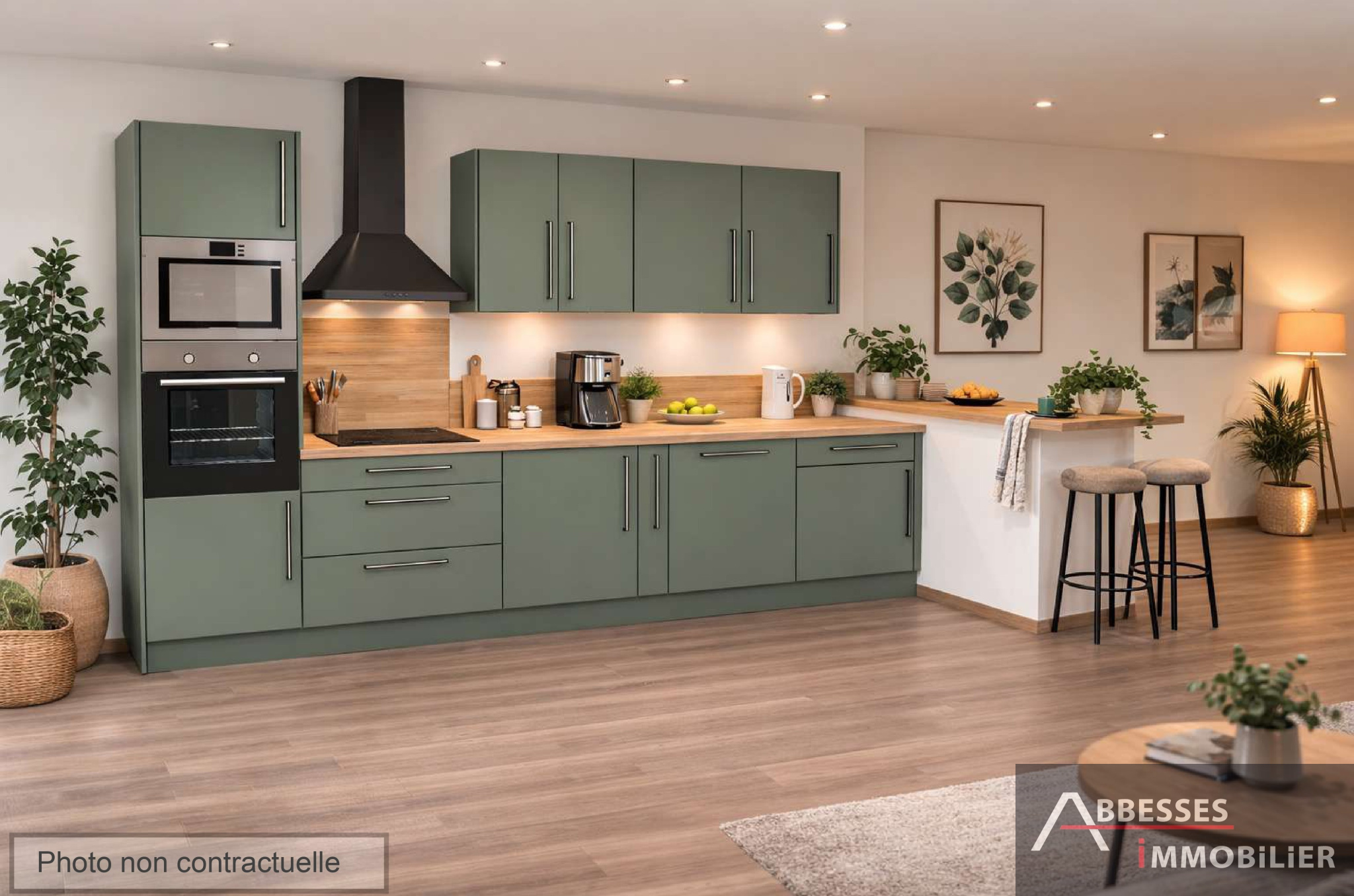 Entrée dégagement, cuisine semi-équipée neuve ouverte (éléments de rangements, plaque de cuisson induction et hotte) sur vaste salon séjour (47m2 l'ensembl...