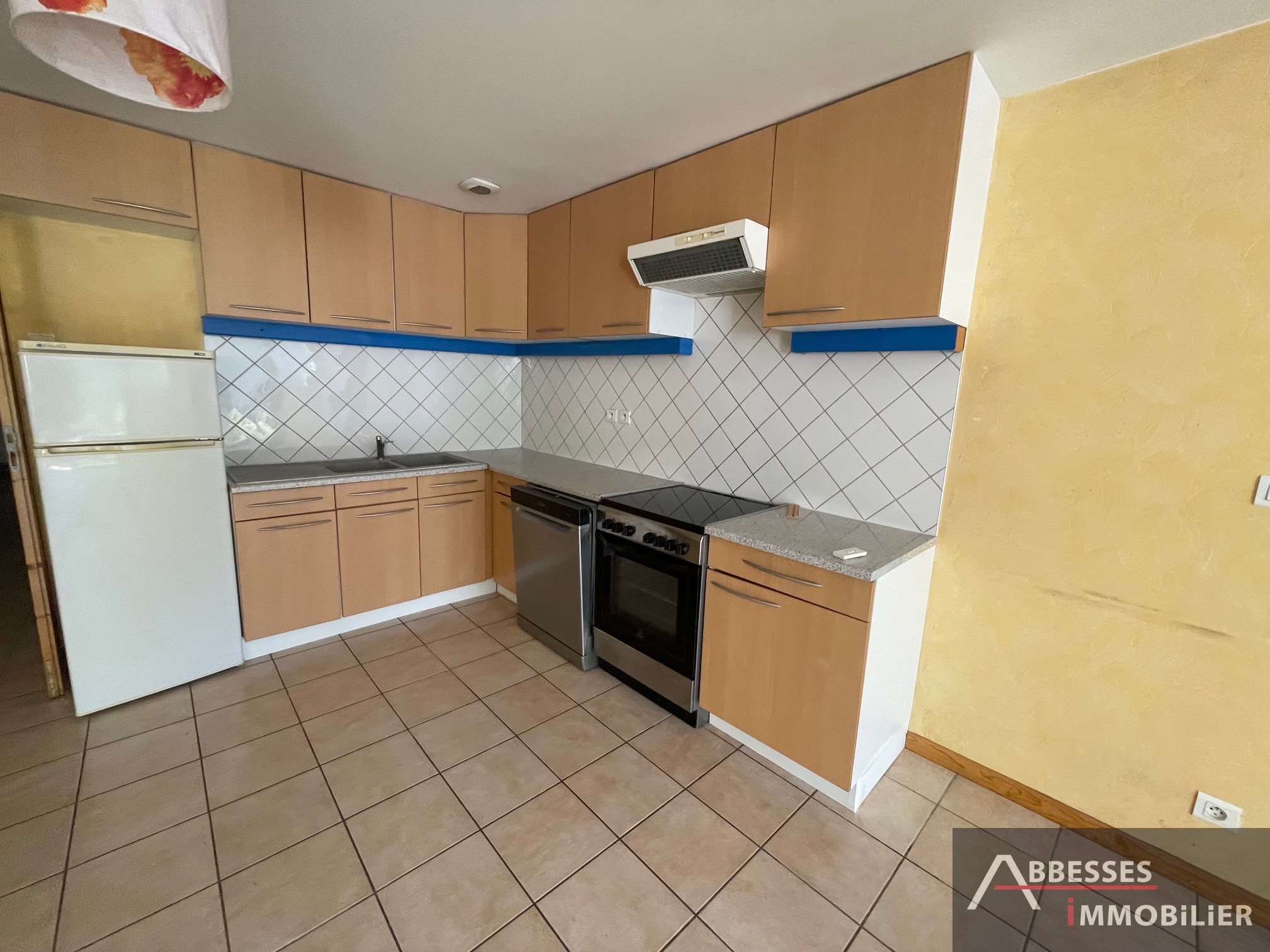Cuisine aménagée équipée ouverte sur pièce à vivre, 2 chambres, salle de douche et wc. Terrasse dallée.
