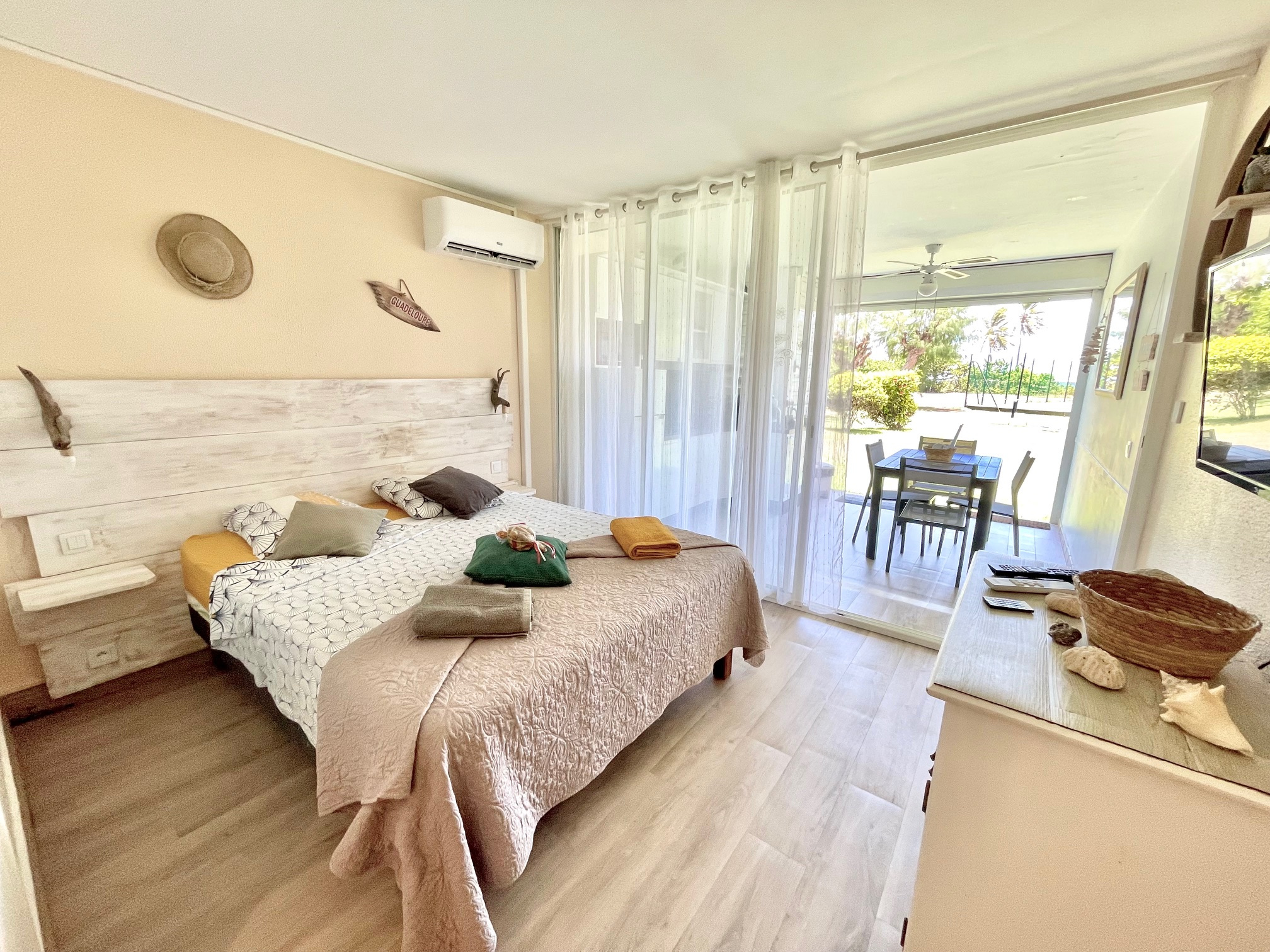 LA MARINA : Studio meublé et rénové de 24,30 m2 (dont 4,3 m2 de terrasse), résidence KAYELA avec ascenseur au coeur de la Marina, plages accessibles à pied ainsi que les commerces, restaurants, golf, boulangerie, médecin, pharmacie, gare maritime, etc... Compo...