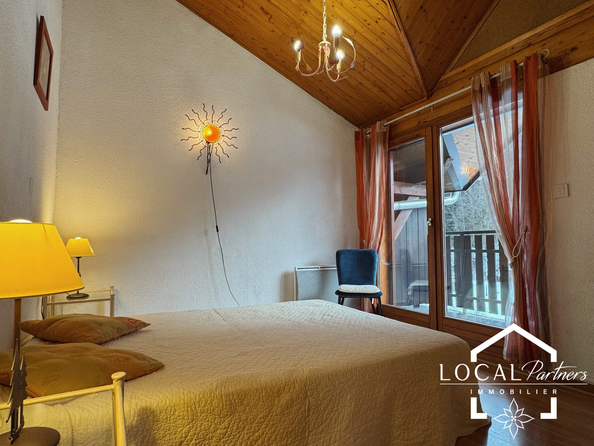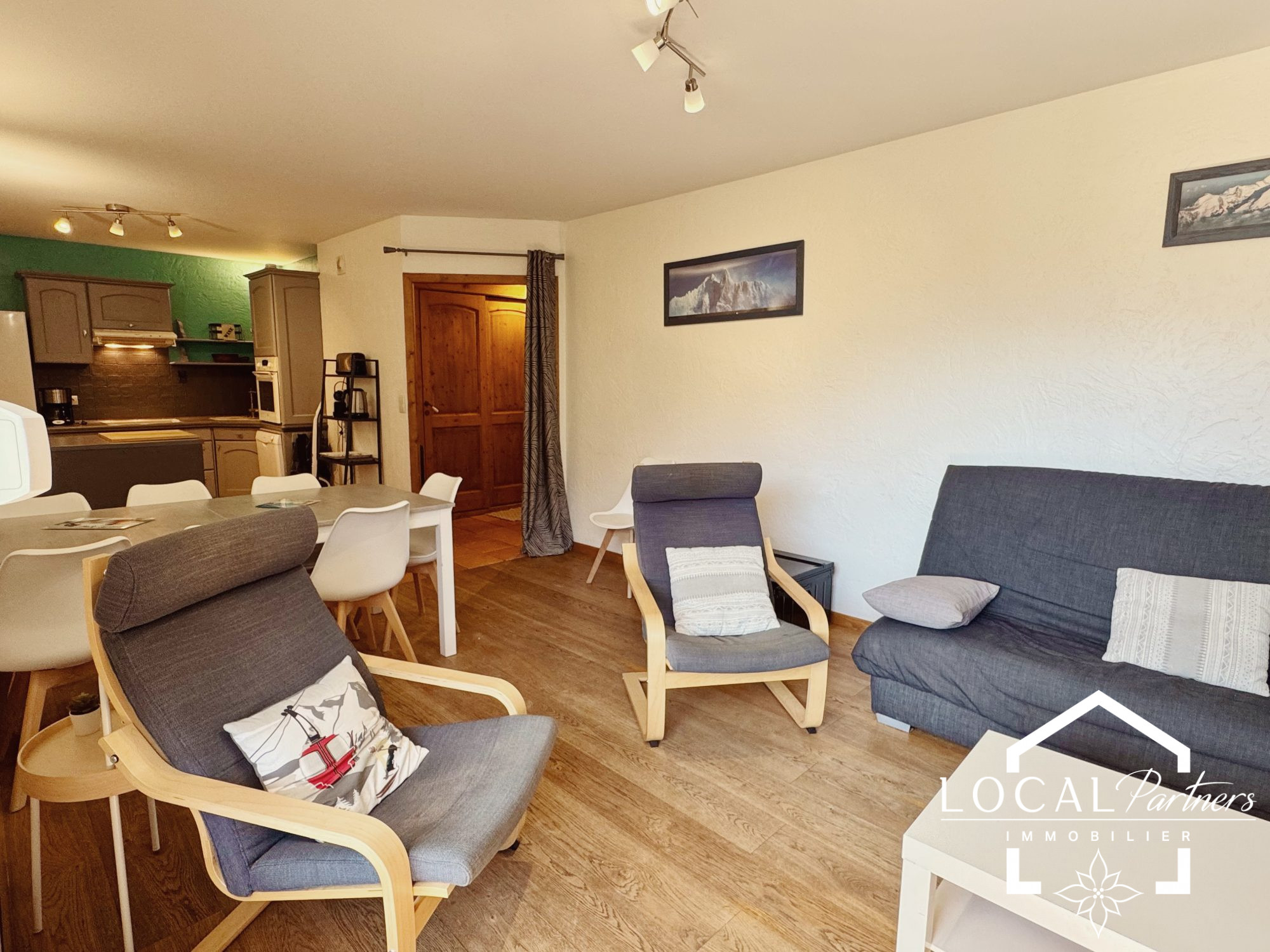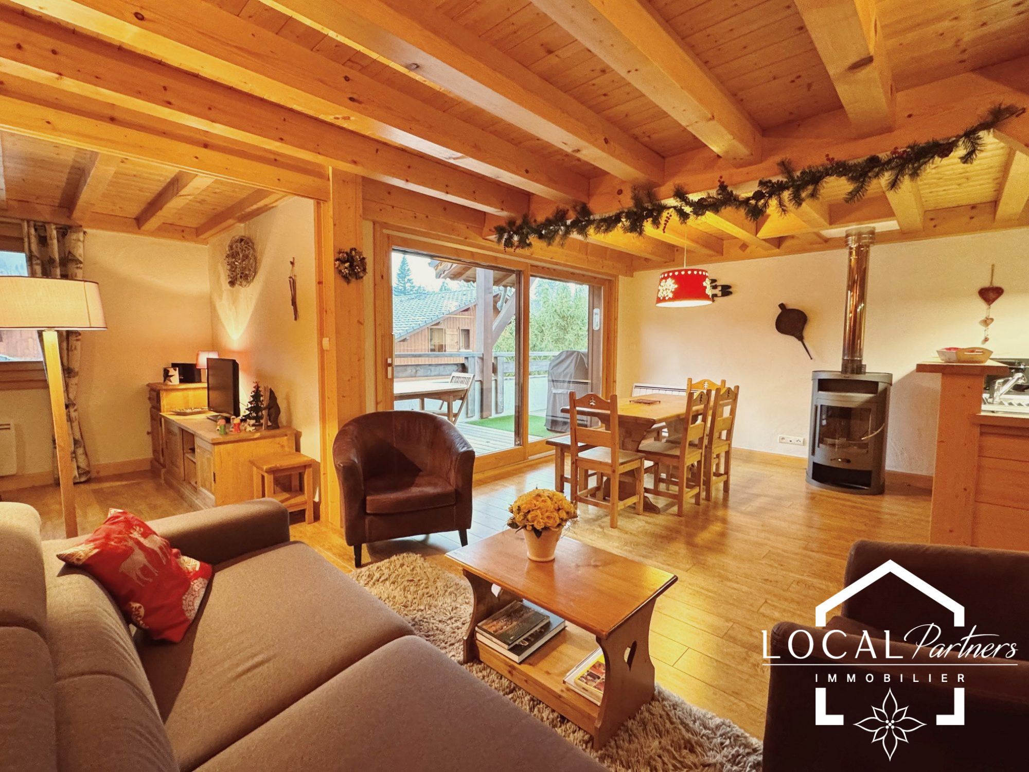 L'appartement comprend un joli espace de vie avec cuisine ouverte sur le coin repas, un poêle à bois imposant qui contribue au confort du lieu, et une partie du salon qui se ferme par une porte coulissante , cr...