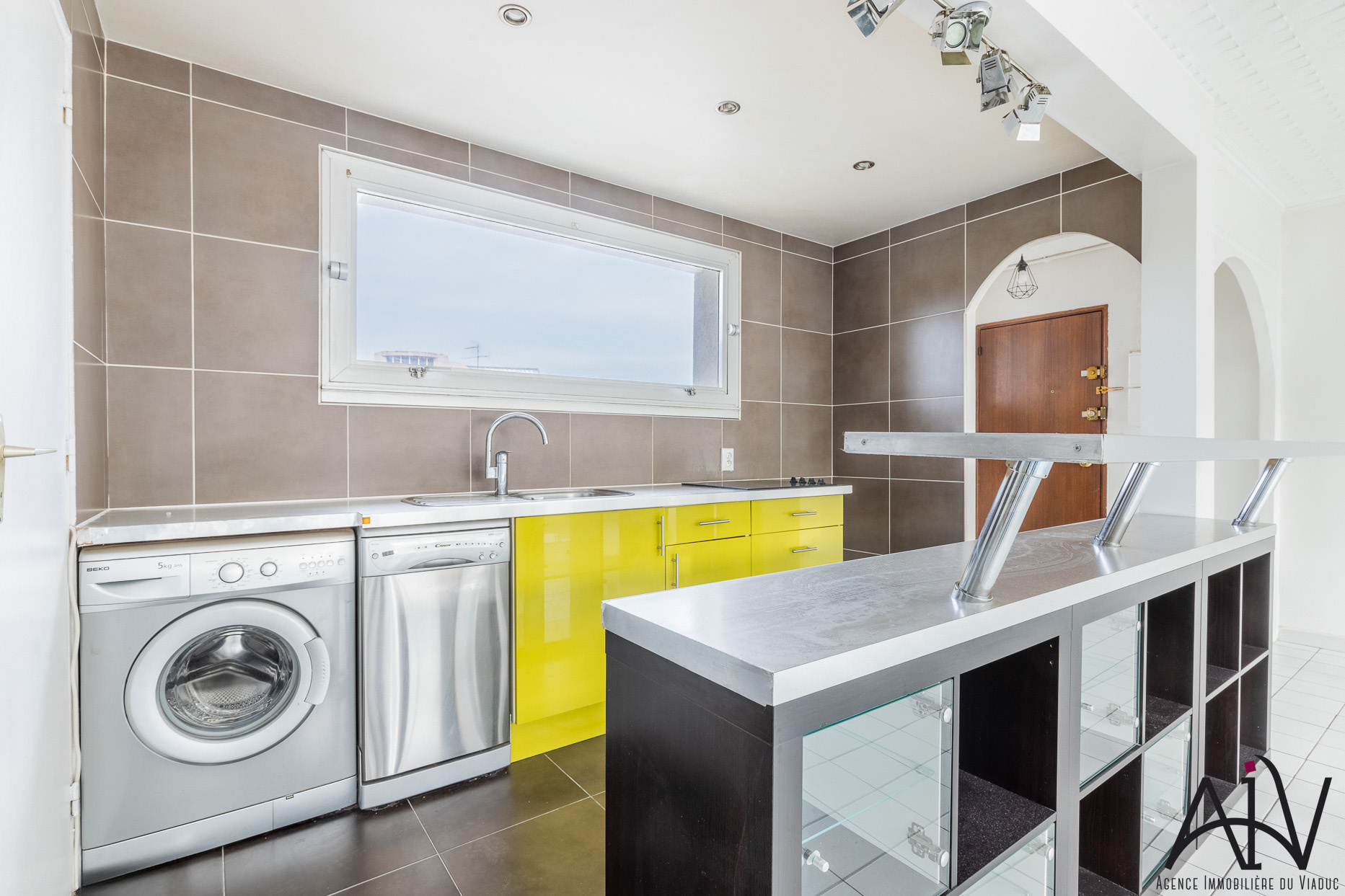 Une entrée, un grand séjour, une cuisine semi-équipée (plaques de cuisson, lav...