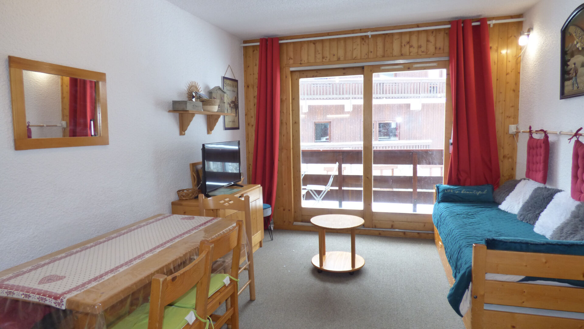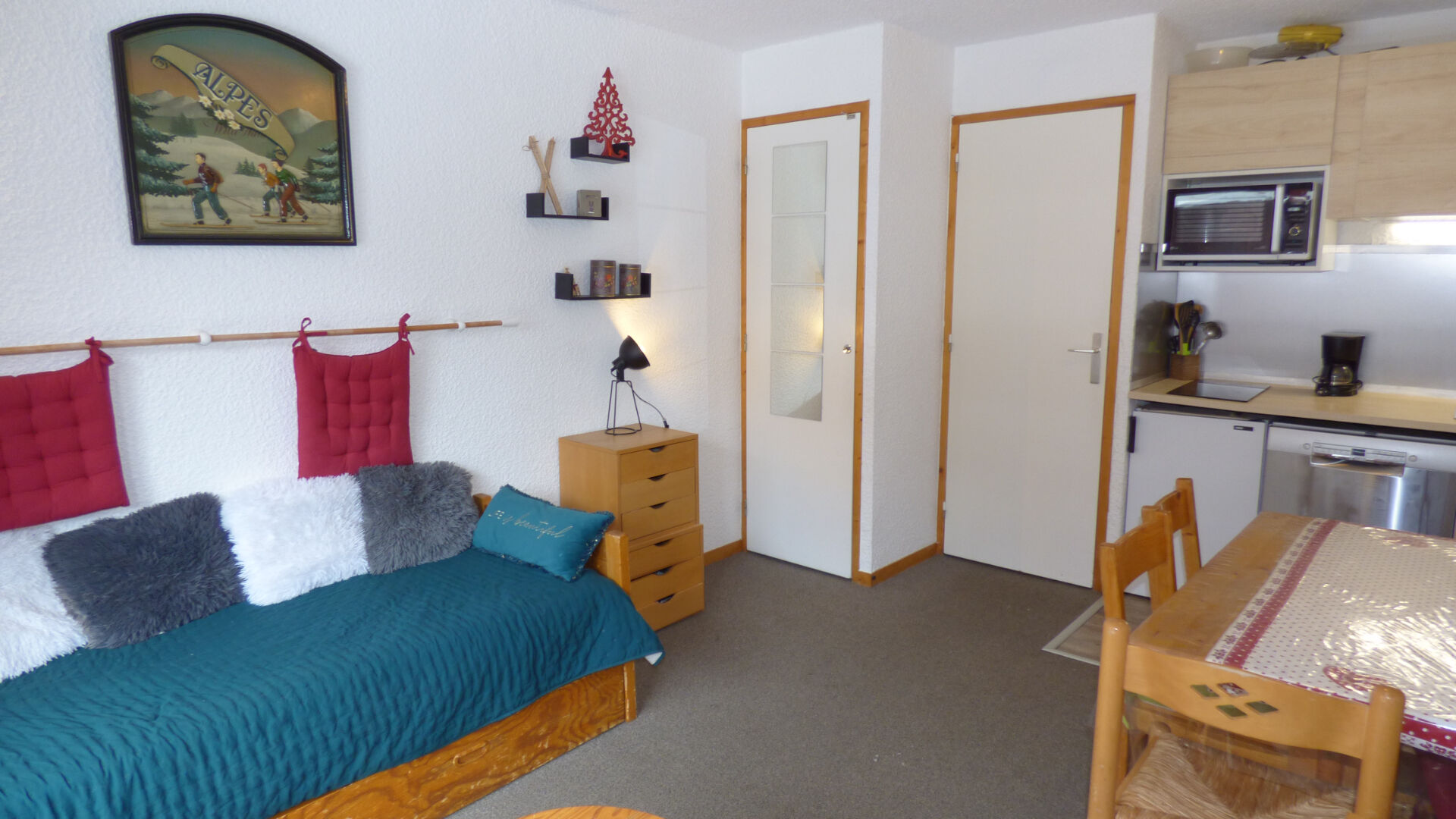 Exclusivité. Mottaret skis aux pieds. Joli studio doté d'un "coin montagne", idéal pour une petite famille de 4 personnes. Il comprend 1 entrée meublée avec 2 lits superposés, 1 séjour avec kitchenette équipée, donnant sur un balcon exposé sud ...
