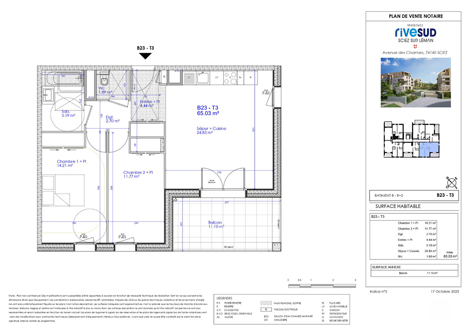 À Sciez, appartement T3 de 66,05 m² (loi Carrez) situé au 1er étage d'une résidence de 2015.