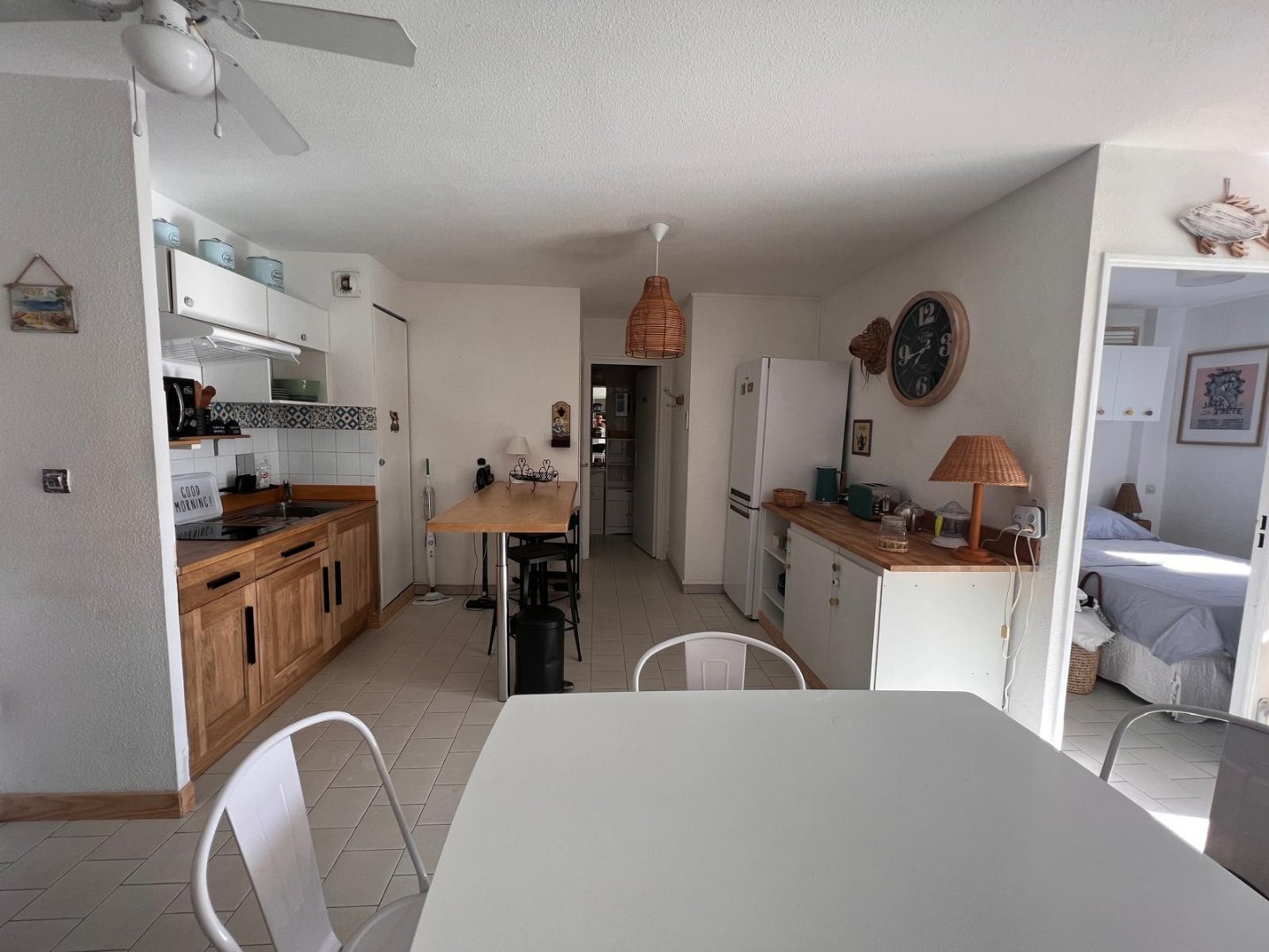 Vous retrouverez un salon-séjour avec cuisine équipée et aménagée.
