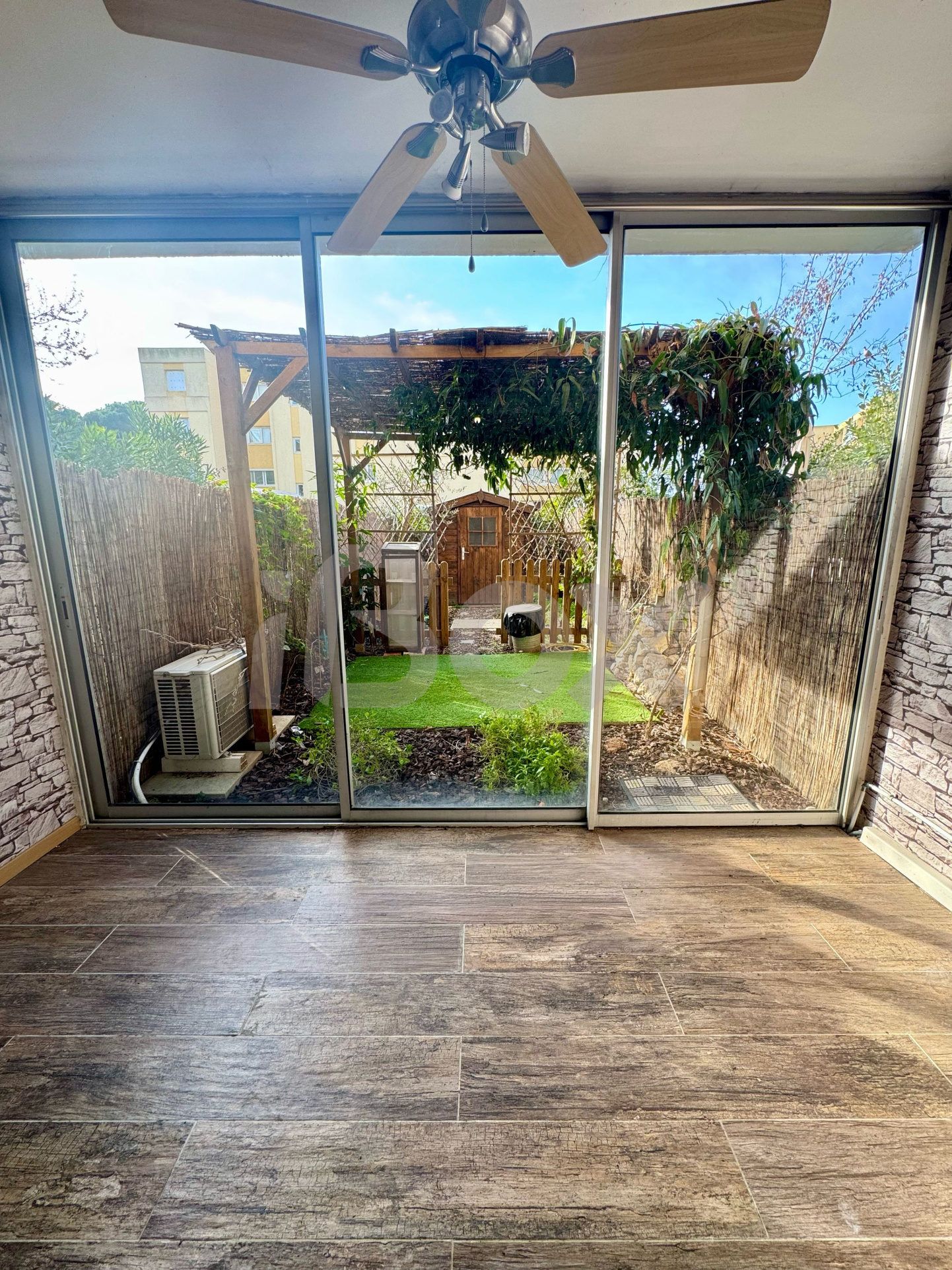 Séjour + cuisine 15m². Chambre, salle de bains, WC séparé. Gardien, piscine et tennis.