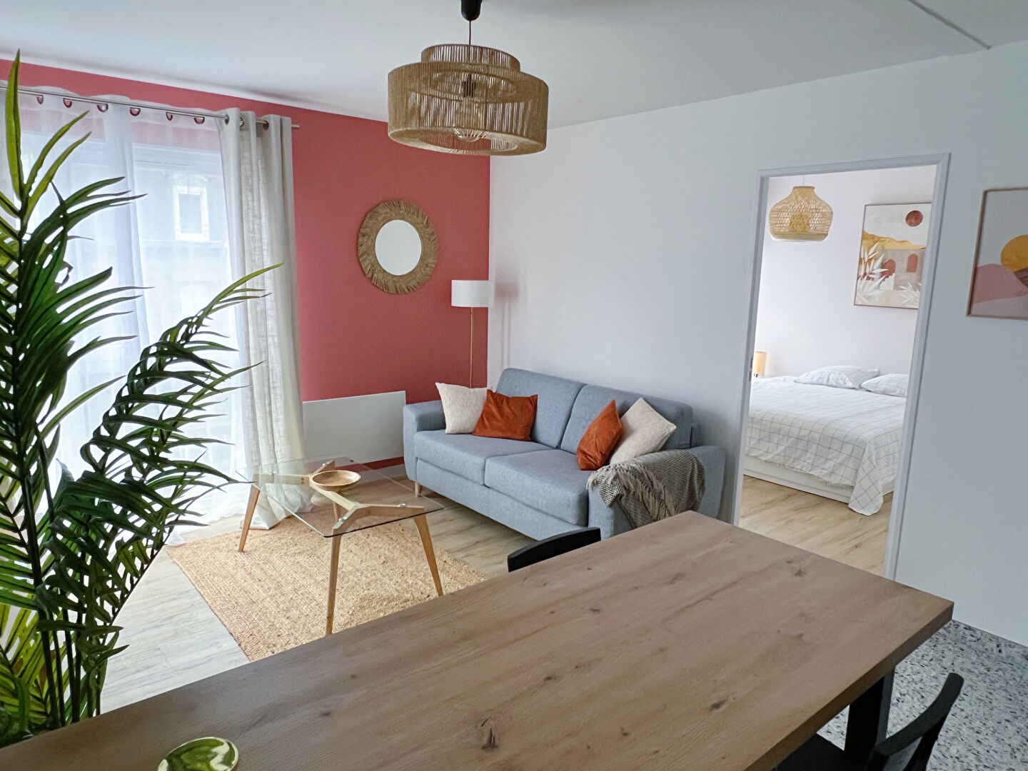 SAINT BRIEUC - CENTRE VILLE Appartement T2 entièrement rénové et meublé avec goût comprenant : une entrée avec placard, une pièce de vie avec cuisine aménagée équipée, une chambre avec placard, une salle d'eau, WC.