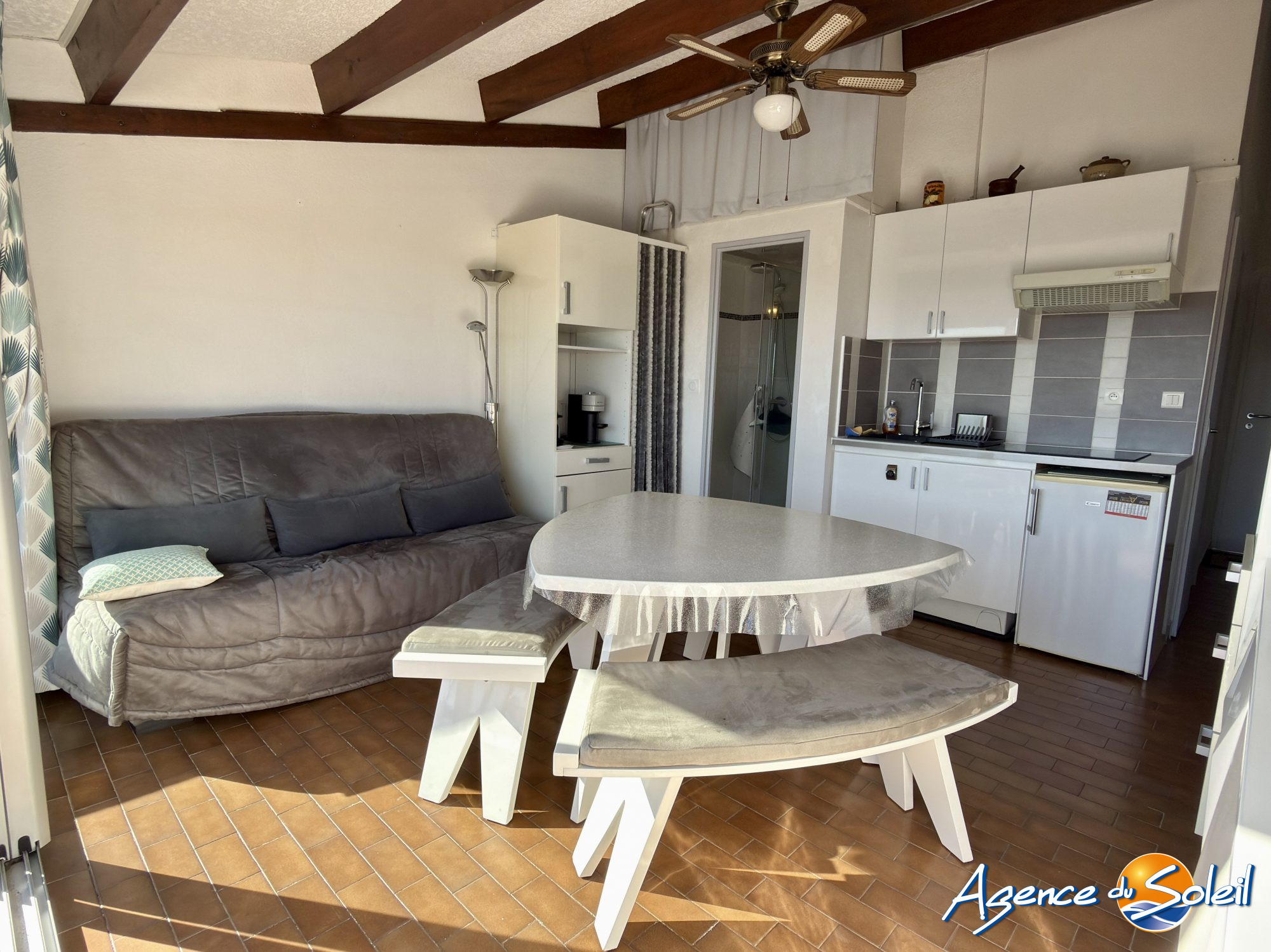 Entrée cabine, chambre, salle d'eau - toilettes, séjour avec cuisine US équipée moderne, terrasse.