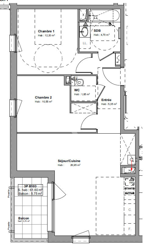 Cet appartement se compose : une entrée avec placards, deux grandes chambres, une pièce de vie...