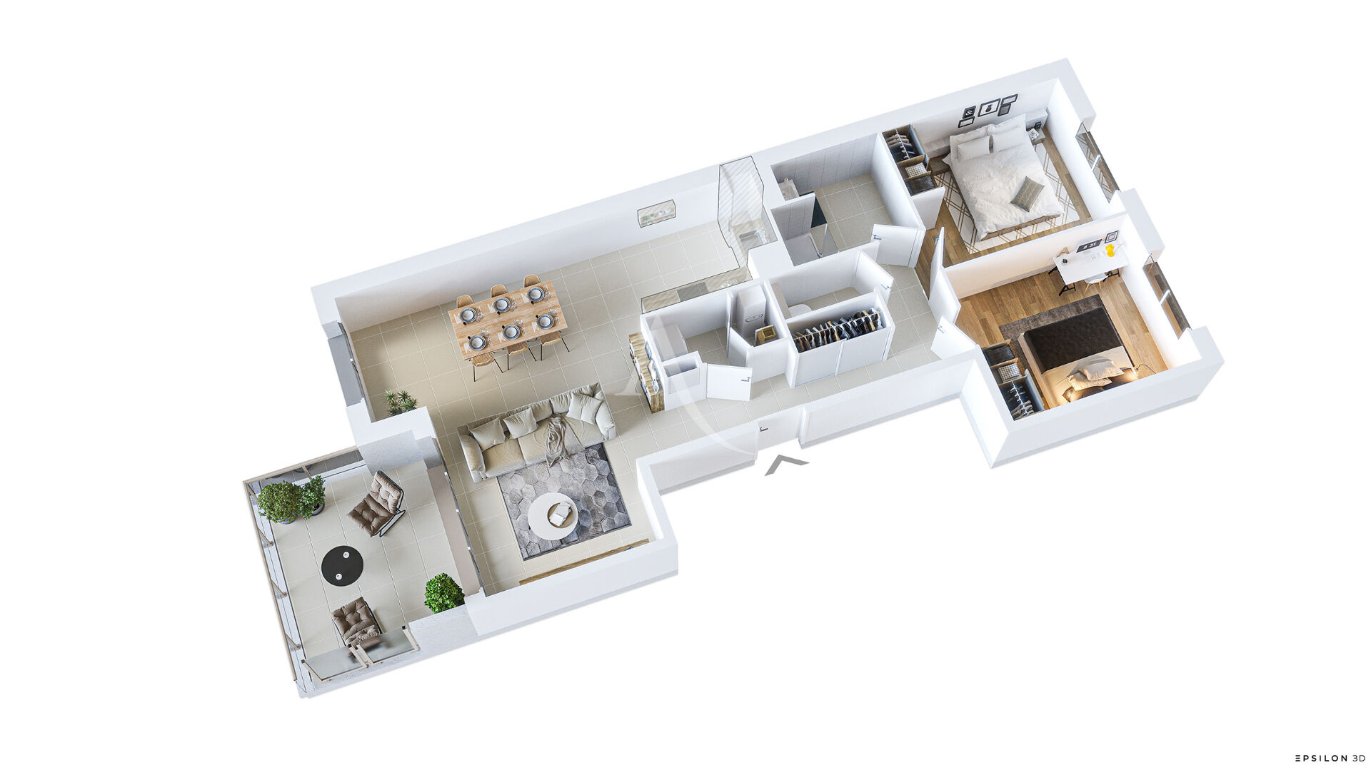 Spacieux Duplex avec entrée, chambre, salle d'eau, WC séparé, salon séjour cuisine donnant sur une terrasse couverte exposé SUD