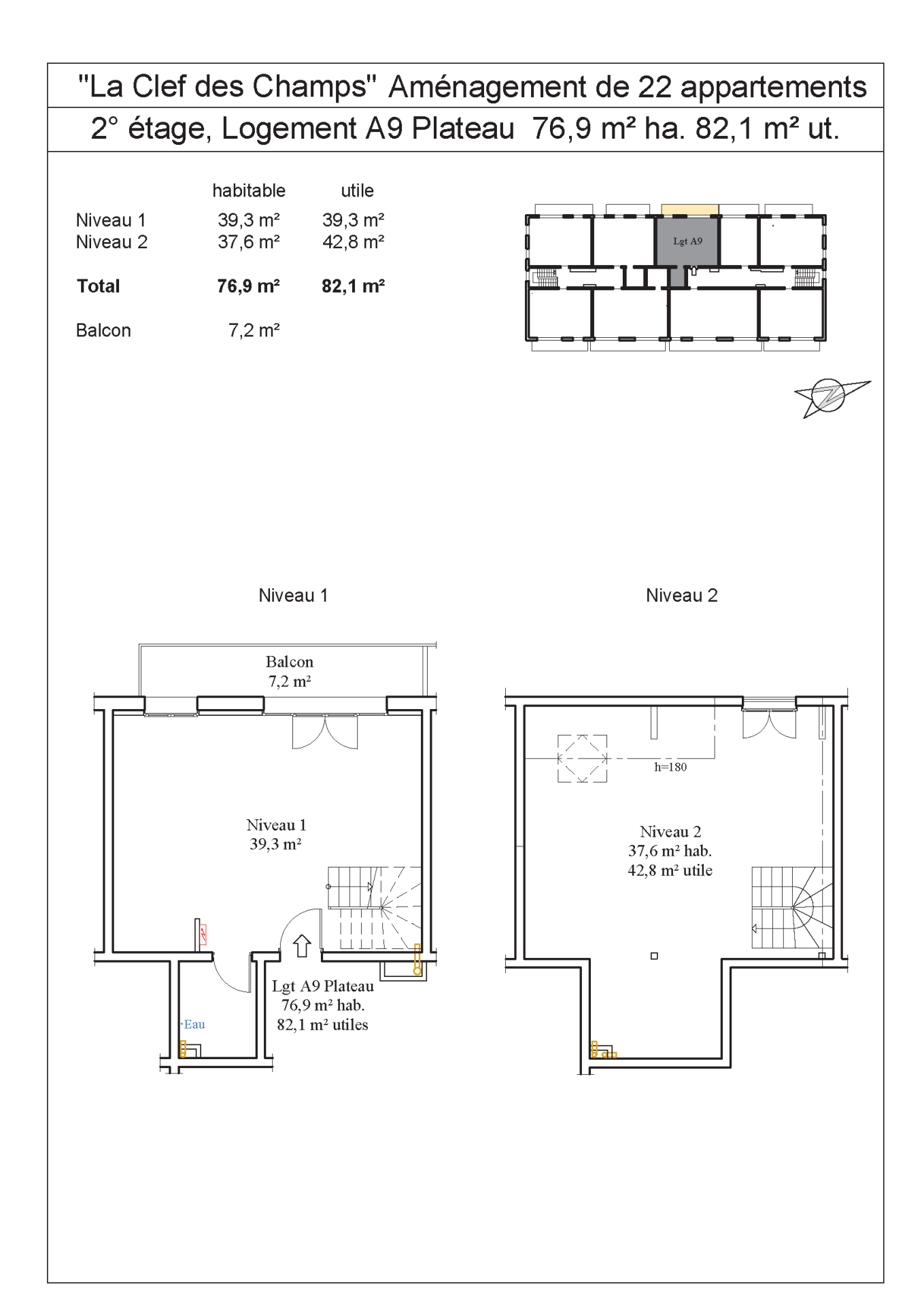 Dans un ensemble immobilier de 22 logements/plateaux sur les hauteurs de Saint-Jeoire, Plateau type T4 au 2ème étage d'une surface de 95.30 m2 + Balcon de 9.50 m2 et une place de parking.