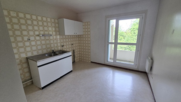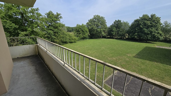 Appartement F3 dans environnement verdoyant : hall d'entrée, cuisine donnant sur une loggia, séjour-salon donnant sur un grand balcon, deux chambres, wc, salle de bains.