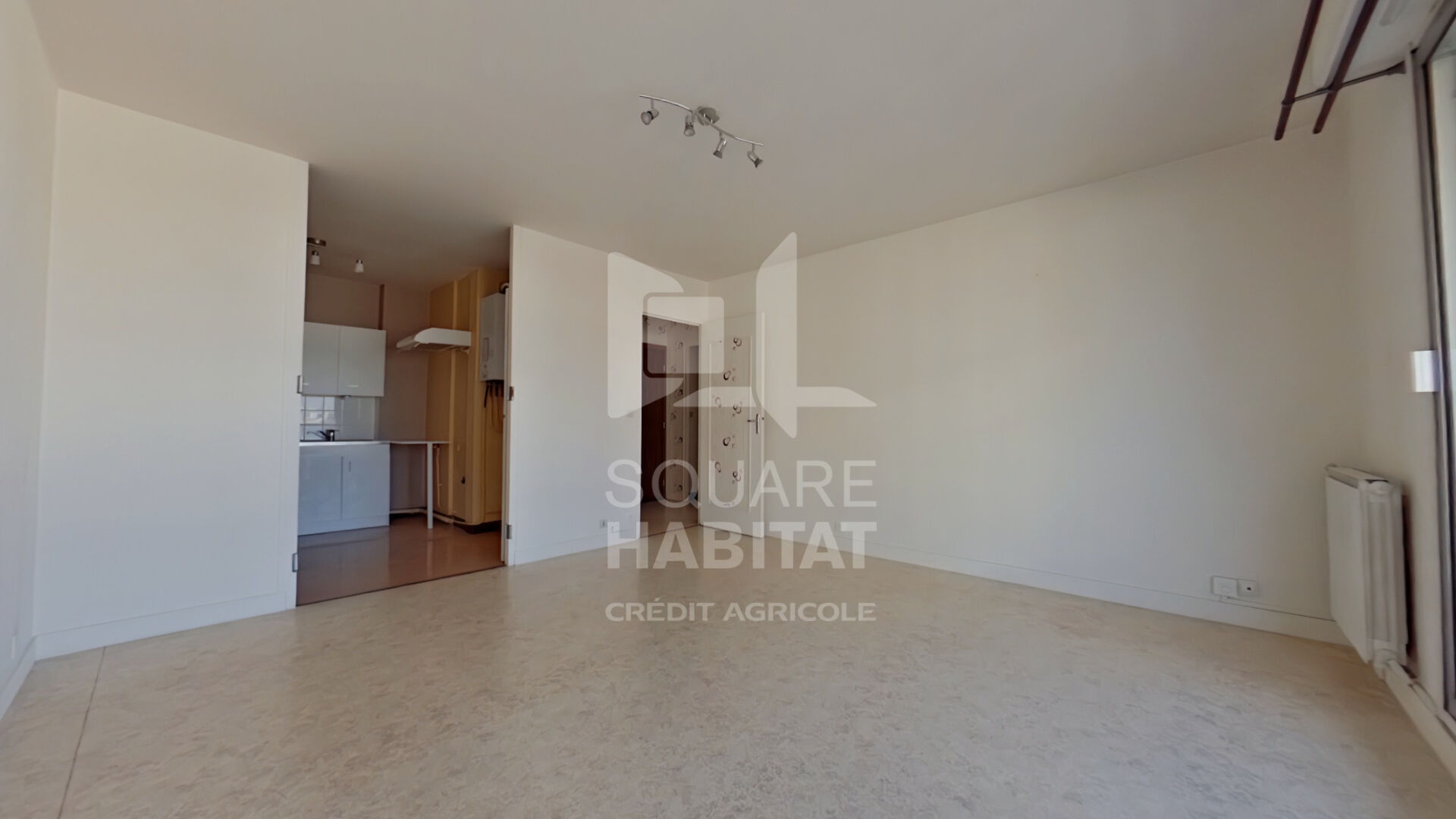 Entrée, grand séjour lumineux avec cuisine ouverte