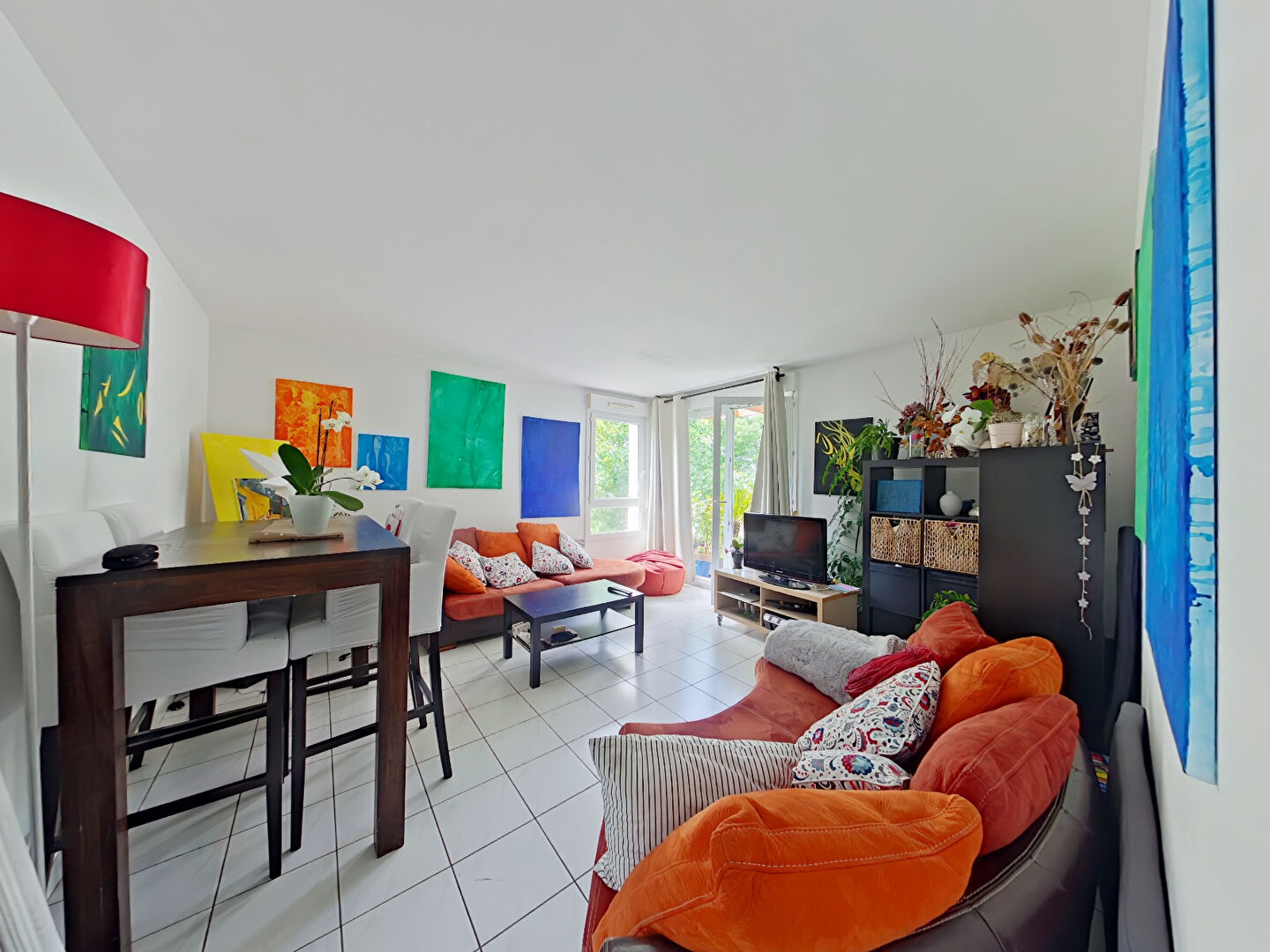 Salon, espace de vie lumineux donnant sur le balcon avec vue sur le parc de la résidence, cuisine aménagée spacie...