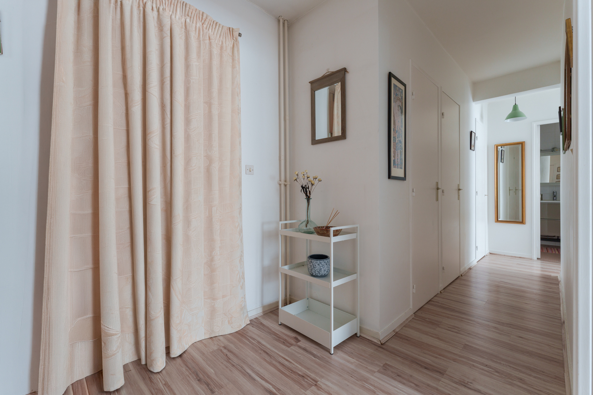 Large entrée, pièce de vie exposée Sud et donnant sur le parc intérieur de la copropriété, cuisine, chambre et salle de bains.