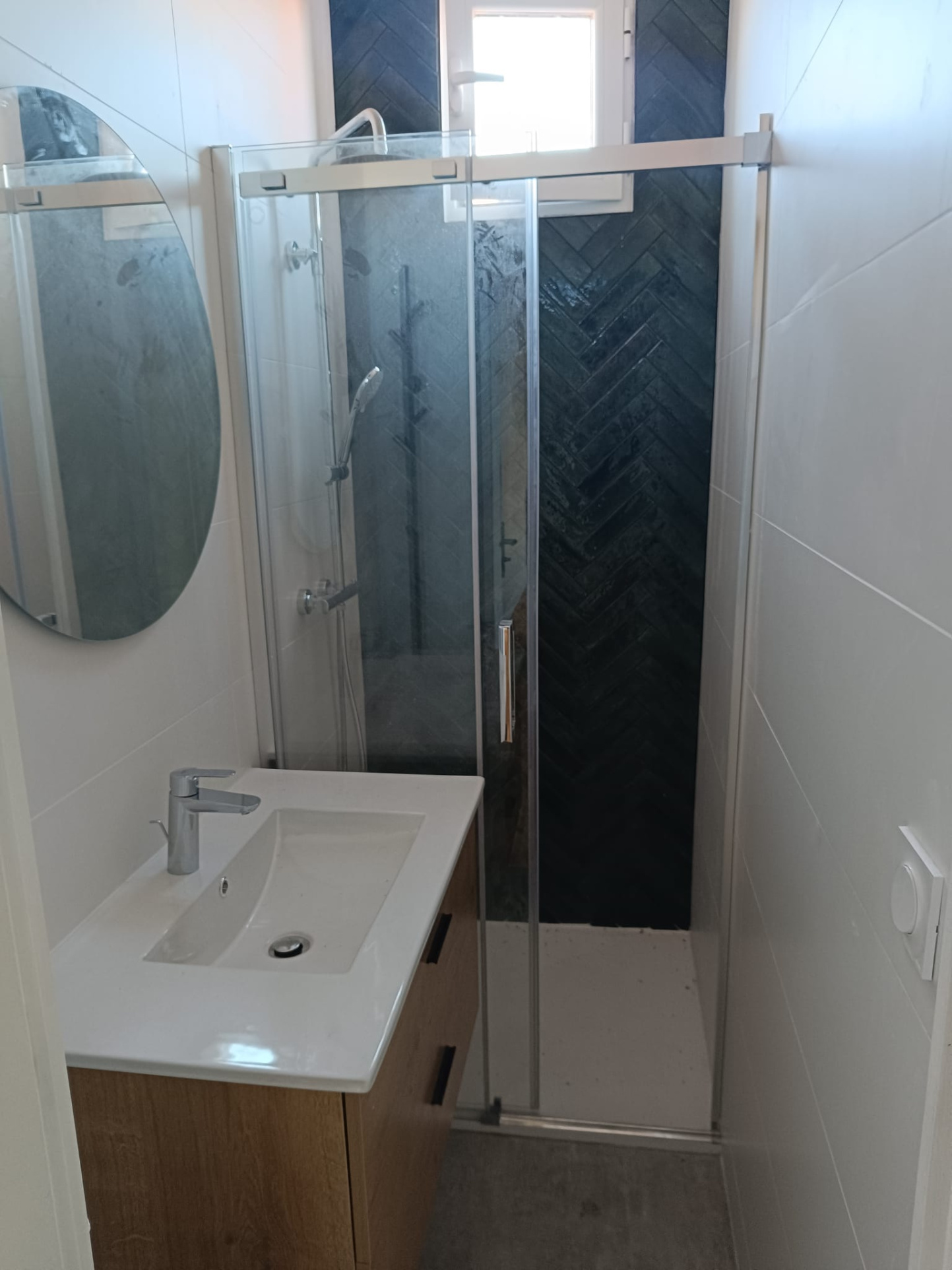 Une entrée, wc, une chambre, salle de bains, une pièce à vivire de 39 m2 avec cuisine salon-séjour, bal...