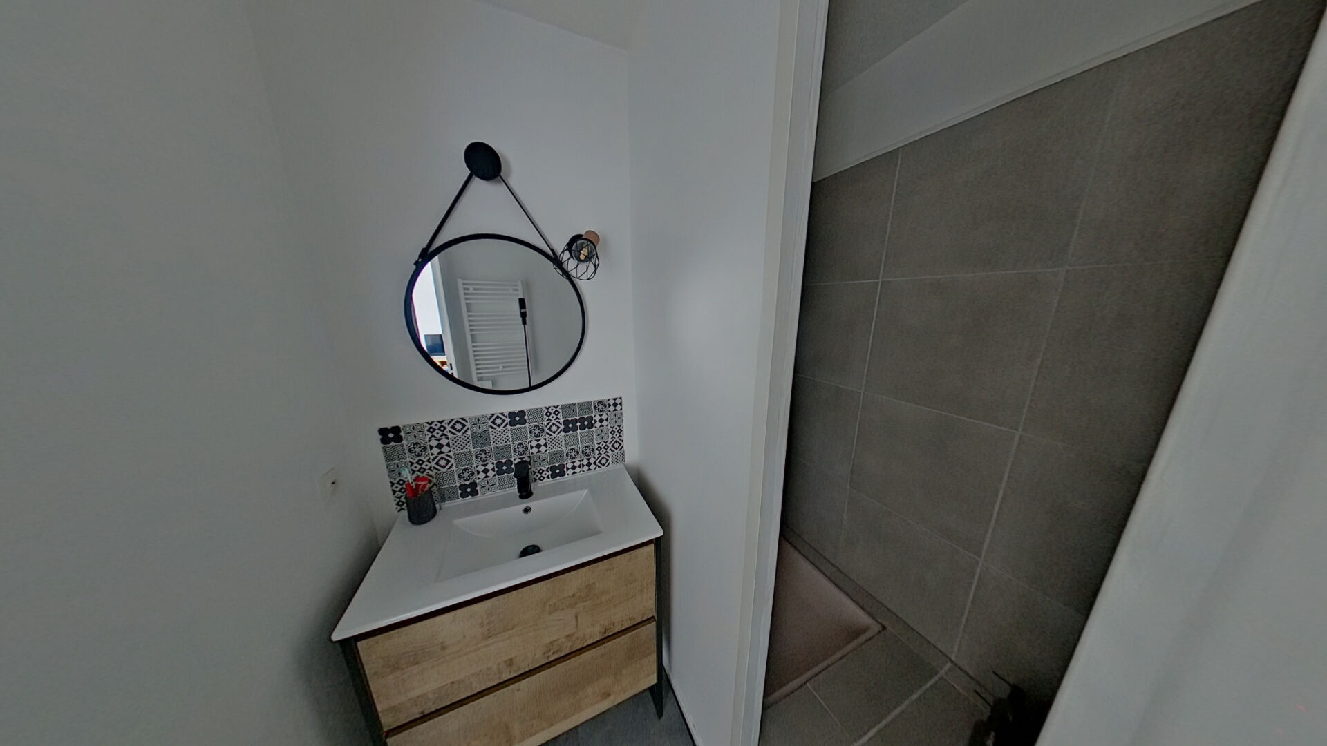 Cuisine complètement équipée ouverte sur le séjour, placard et salle d'eau avec wc.