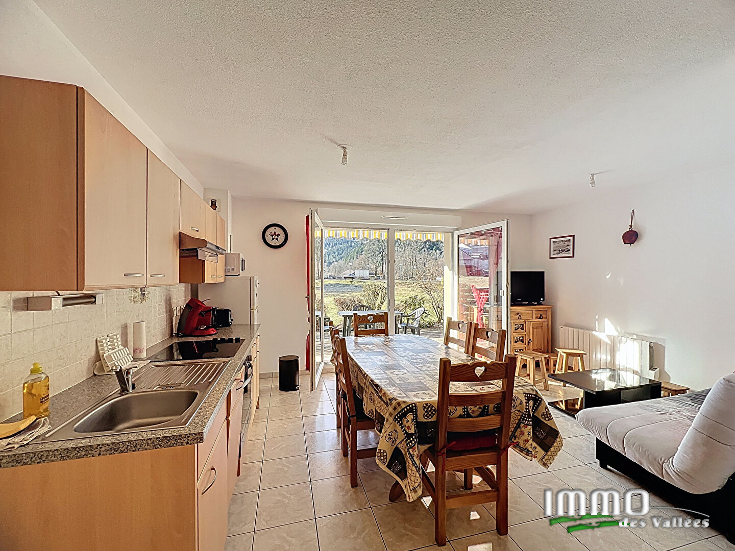 Appartement rénové au pied des pistes, offrant un espace de vie cosy et fonctionnel. une cuisine aménagée equipée ouverte sur coin repas / salon, une grande chambre 4 couchages, une salle d'eau avec wc