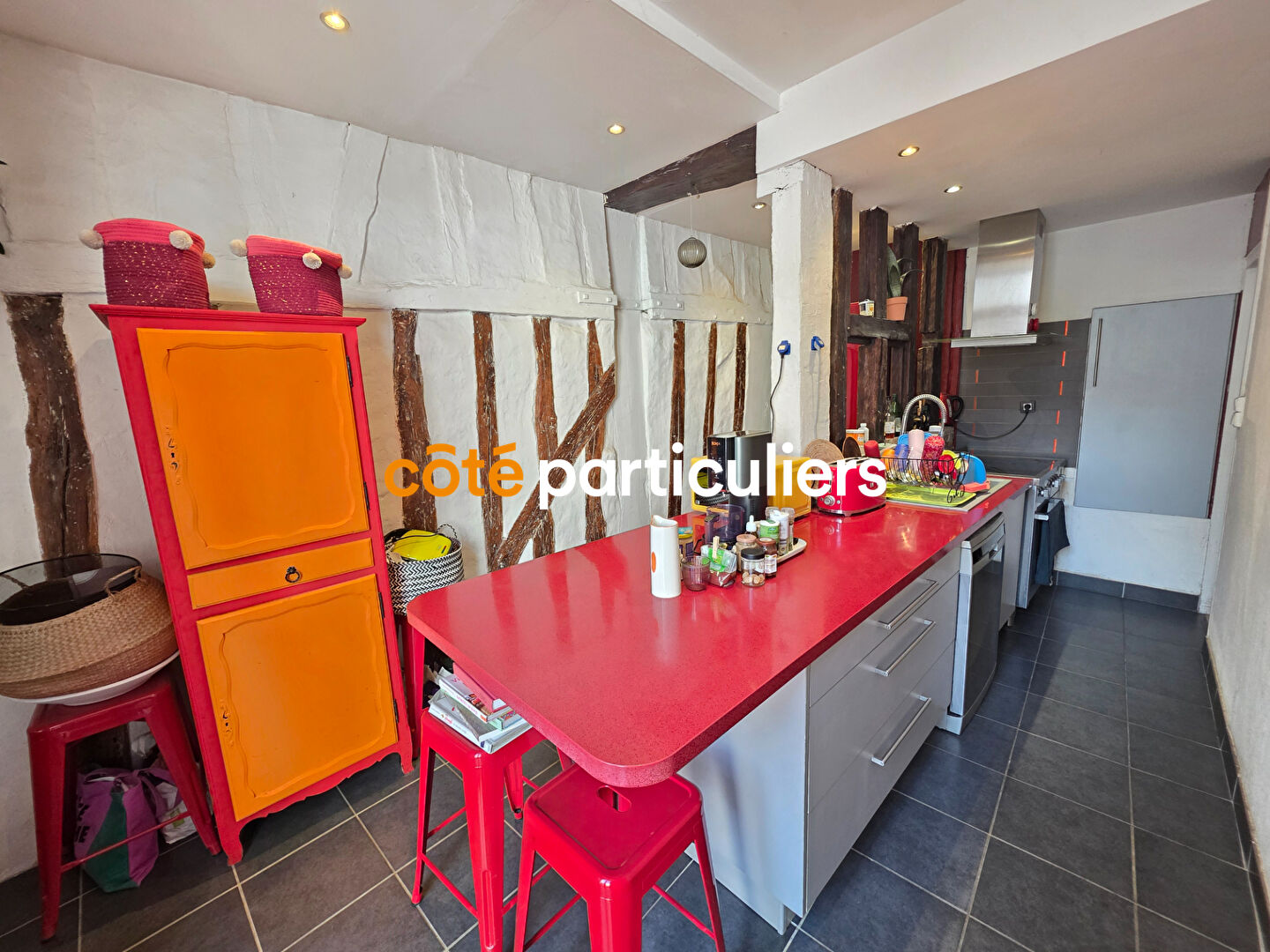 Par une entrée, aux murs en colombage, vous accèderez au premier étage, composé d'une cuisine indépendante aménagée et é...