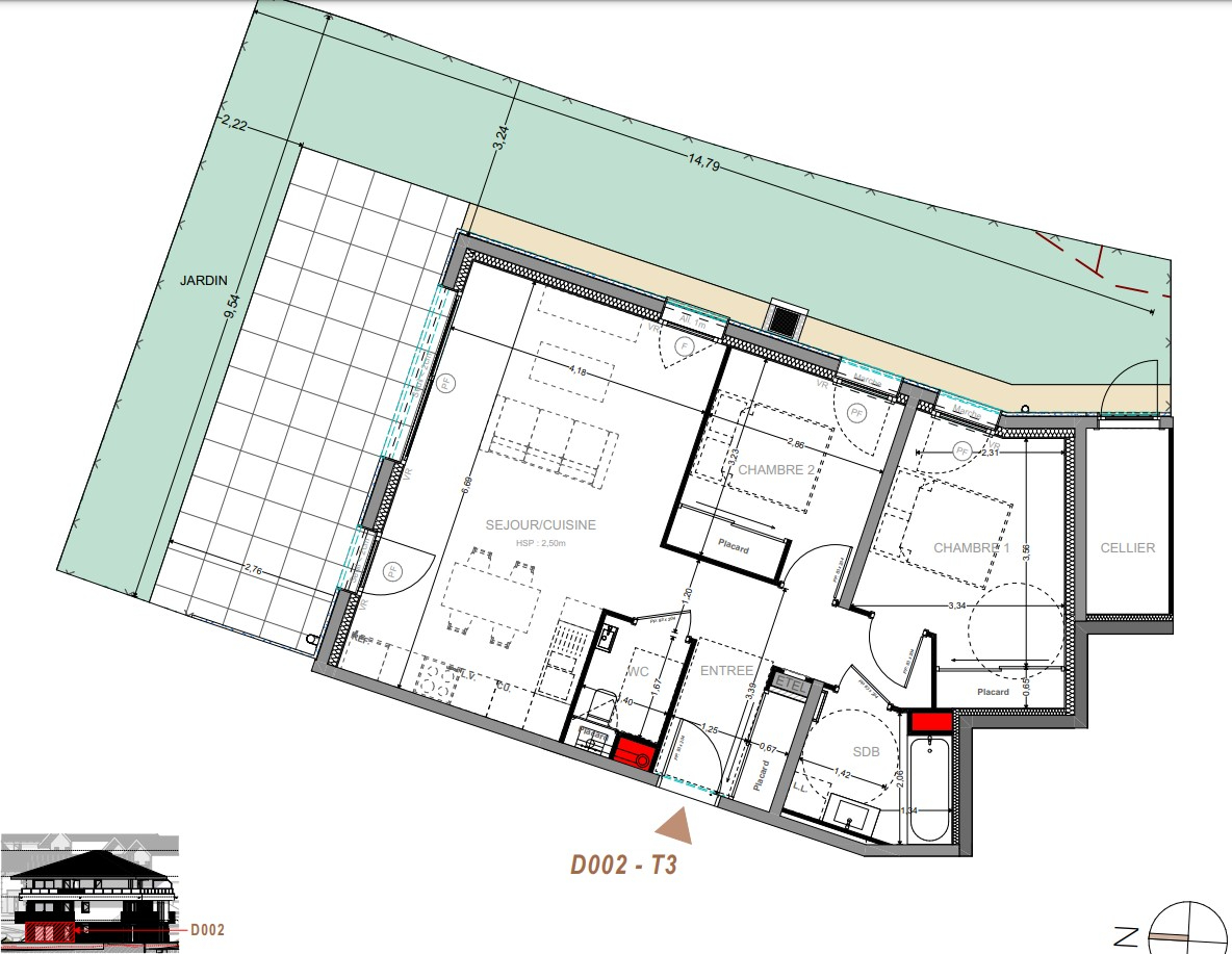 Appartement de type T3 en rez de jardin, 65.92m² + terrasse 15.49m², jardin 82.97m² , cave.