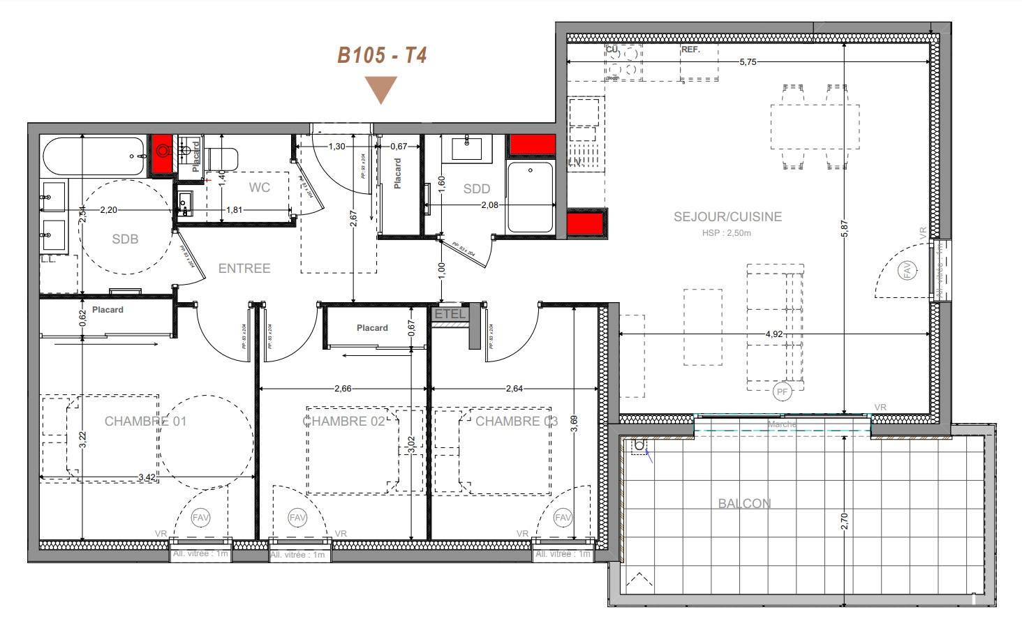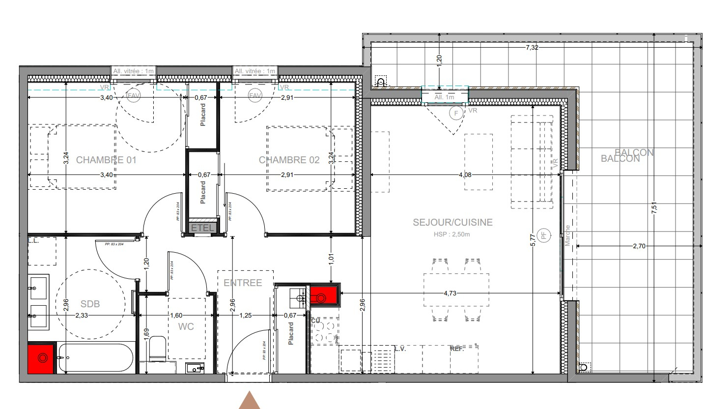 Appartement de type T4 au 1er étage, 81.81m² + grand balcon de 15,63m², cave.