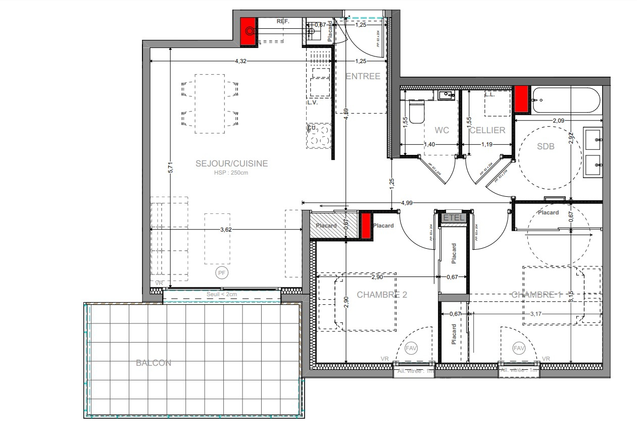Appartement de type T3 au 1er étage, 81.81m² + grand balcon de 15,14m², cave.