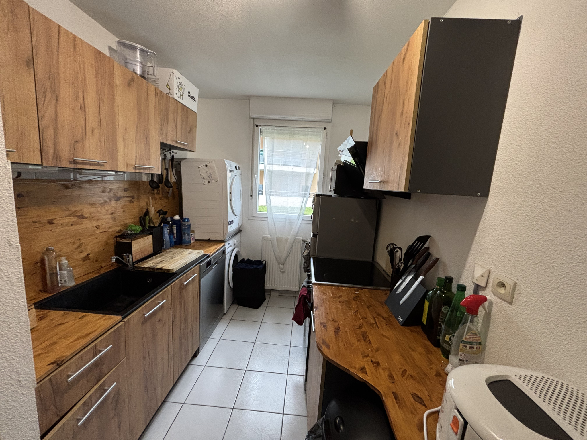 Une entrée, une cuisine séparée équipée, un séchoir, un couloi...