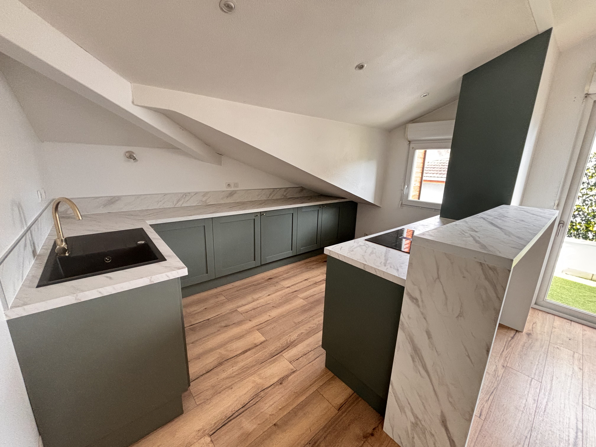 Une cuisine ouverte sur le séjour avec accès sur son son extérieur d'une surface d'environ ...