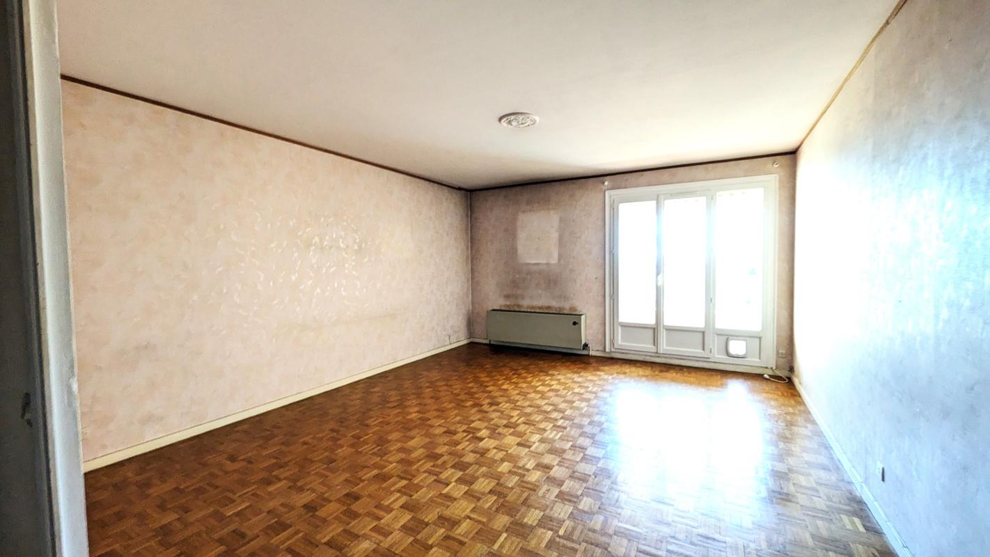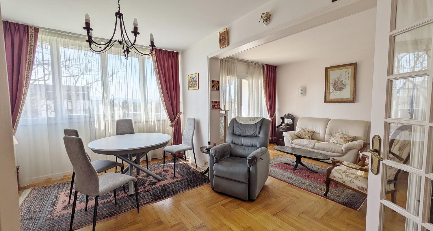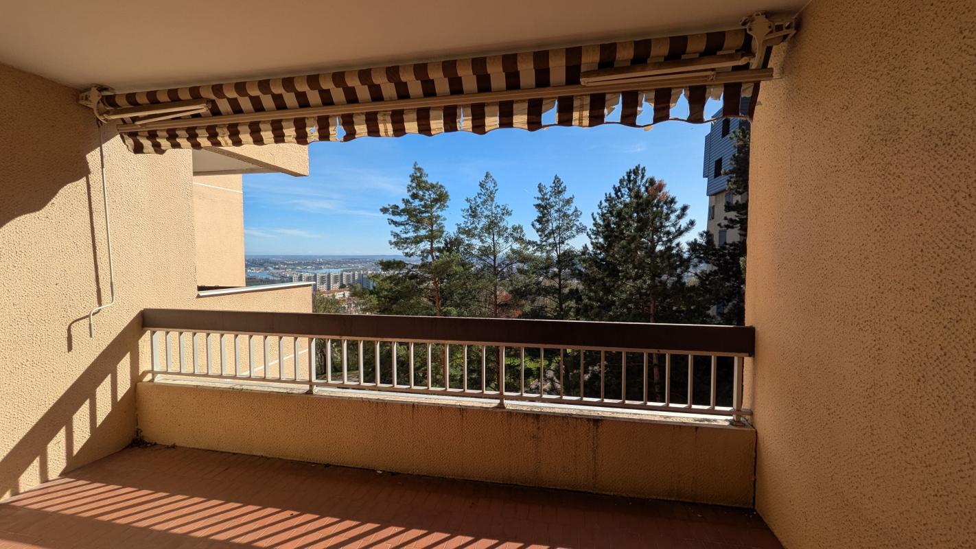 Lyon 5ème. Dans un havre de verdure, très bien desservi (métro Gorge de Loup à 7 mn en bus). Un type 4 de 85,48 m². Le beau grand séjour avec sa cuisine équipée, donne sur le balcon, sans aucun vis à vis.
