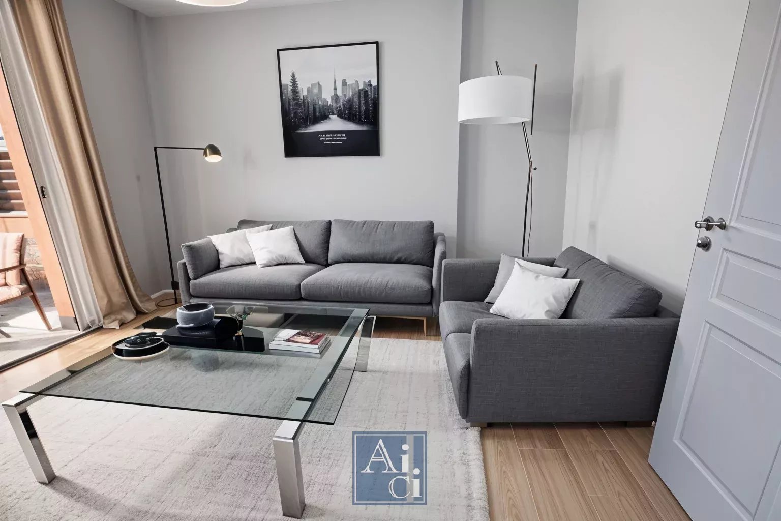 Séjour lumineux avec double baie vitrée ouvert sur une grande terrasse.