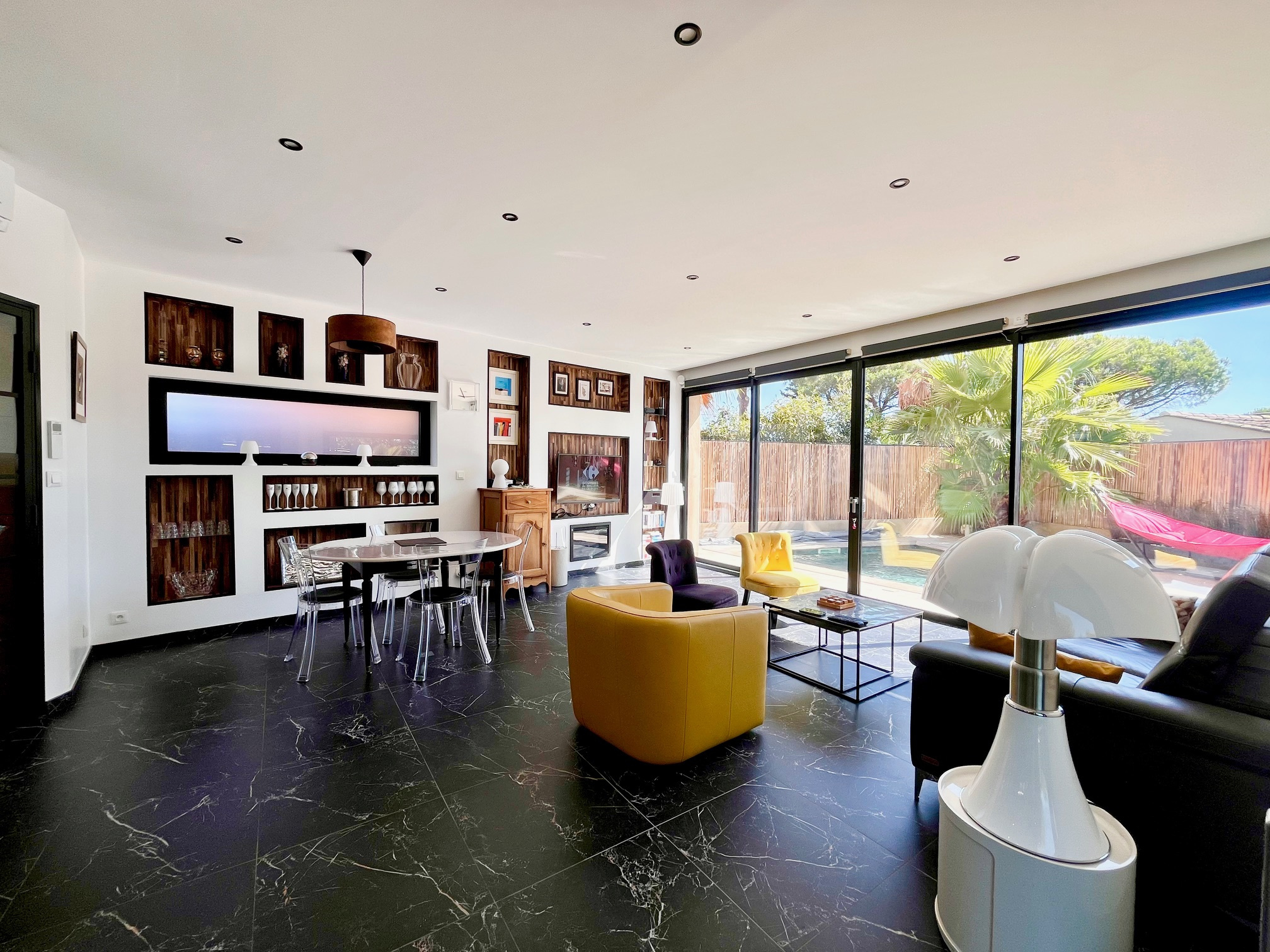 Dans un quartier résidentiel, au calme. Villa récente vue mer. Grande pièce de vie exposée sud, trois chambres dont une suite parentale de plain-pied donnant sur la terrasse et la piscine, vue mer. Appartement indépendant équipé. Piscine au sel. Terrain arboré...