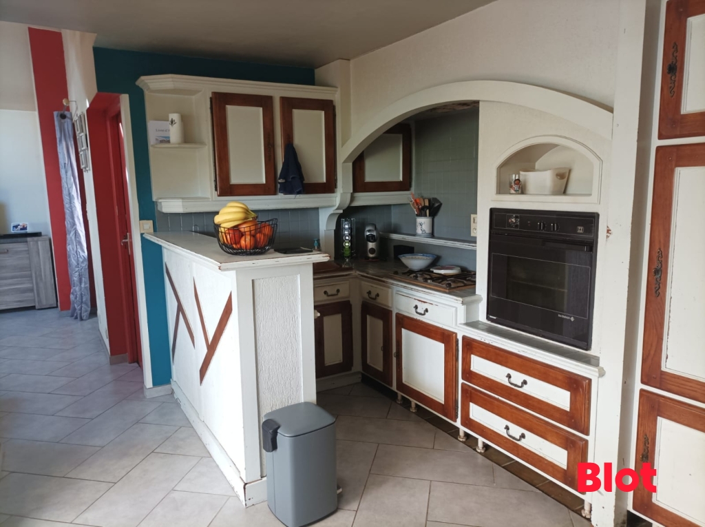 - une entrée, un salon-séjour avec poêle à bois, une cuisine aménagée, chambre et wc