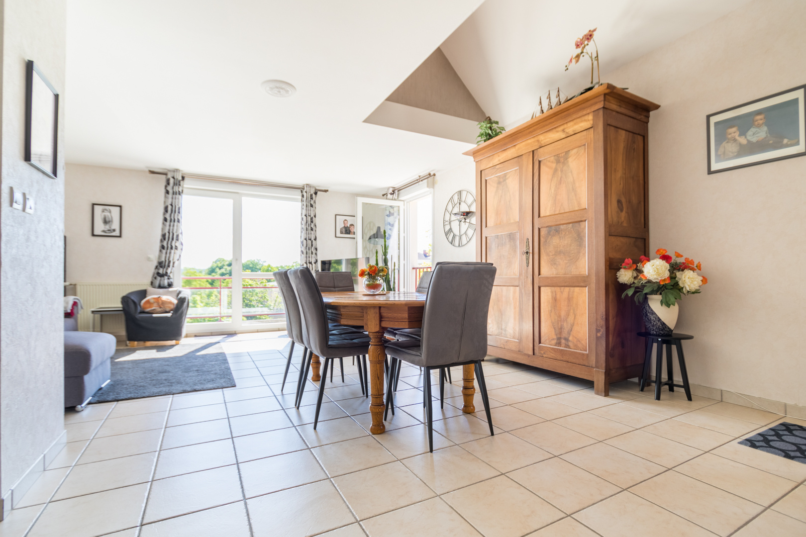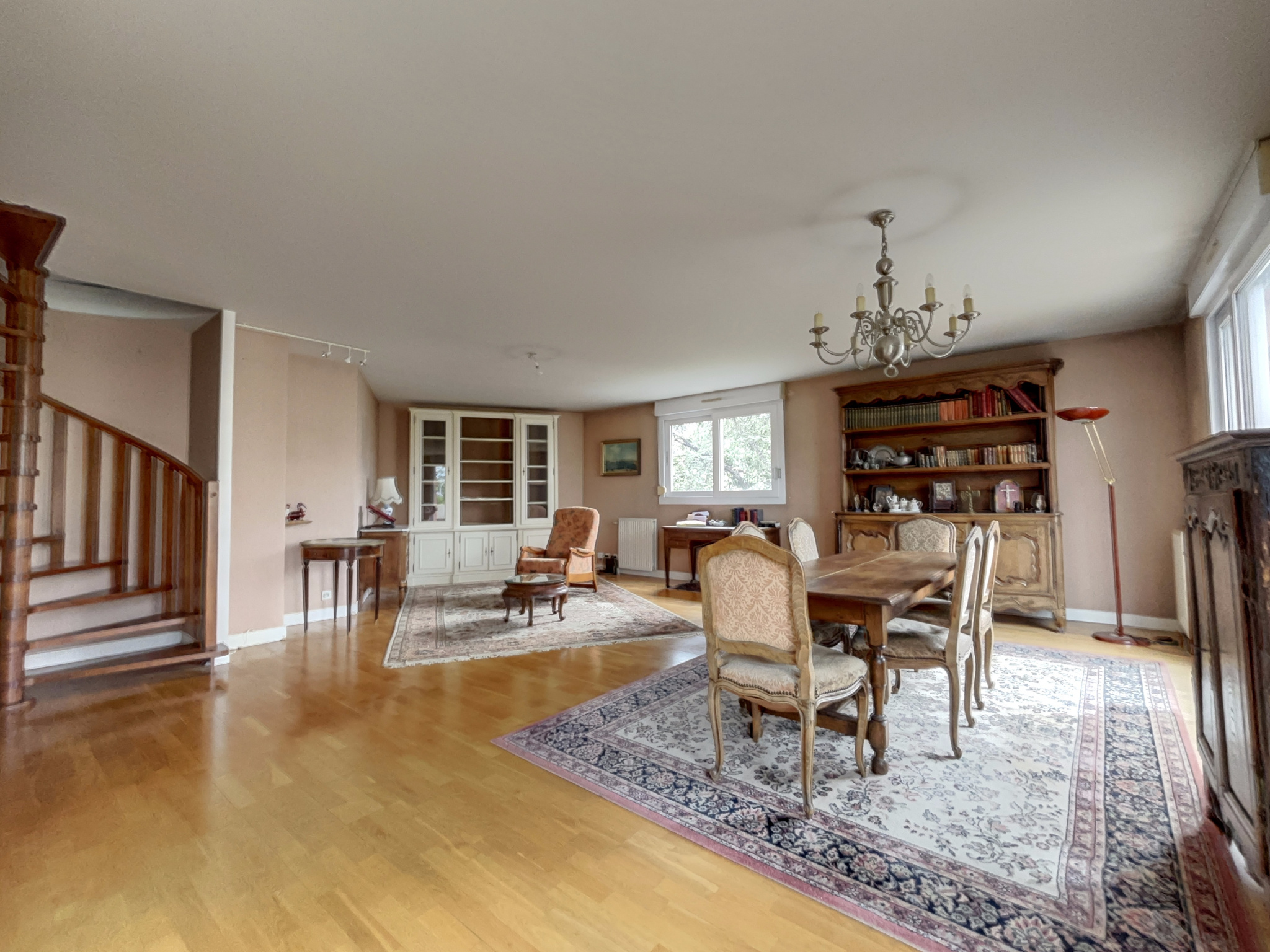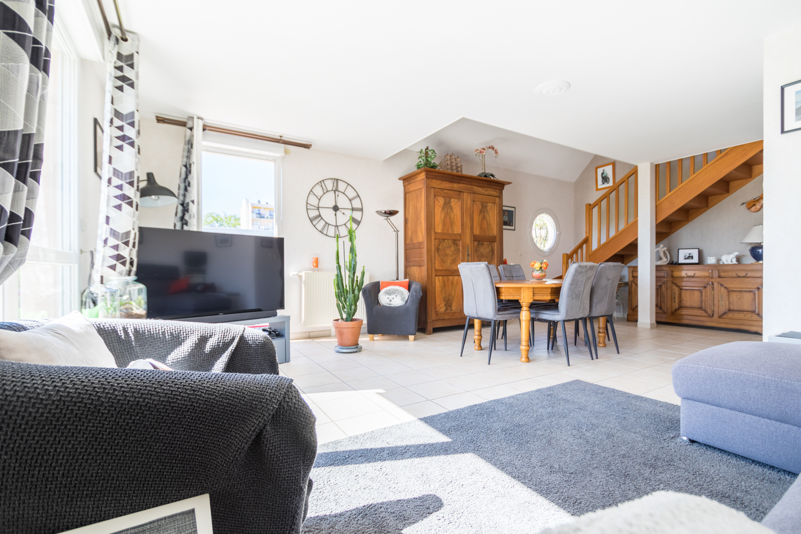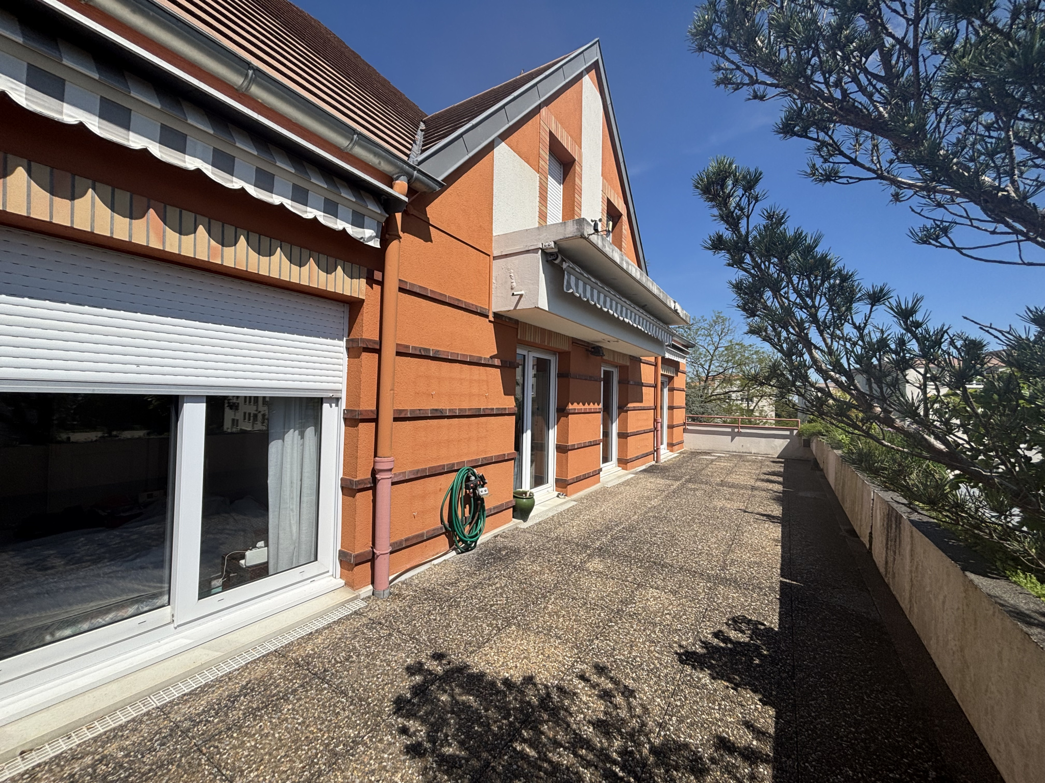 Dans petite résidence au calme, vaste duplex en dernier étage, lumineux, grande cuisine aménagée et salon-séjour donnant sur balcon /terrasse au sud, 1 chambre avec salle d'eau ; à l'étage, 3 chambres et salle de bains. Nombreux rangements.