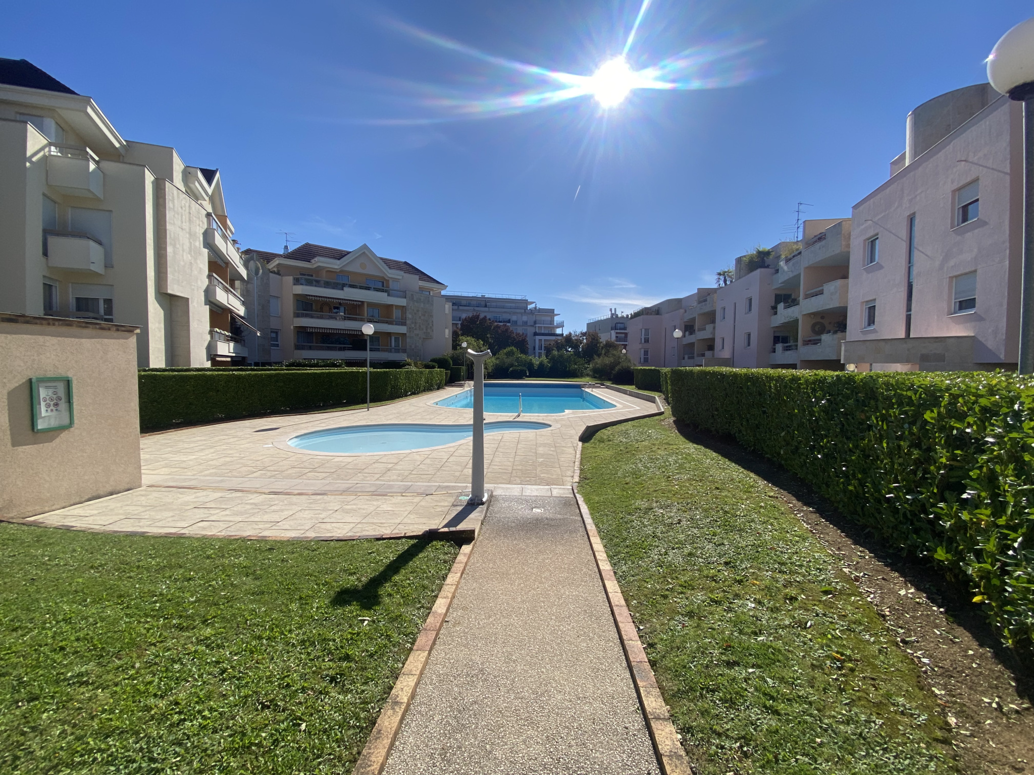 Dans résidence avec Piscine (3 bracelets), appartement de type 2 comprenant entrée, cuisine équipée sur balcon terrasse, pièce à vivre, une chambre, salle de bains et WC séparés. Cave en sous-sol.