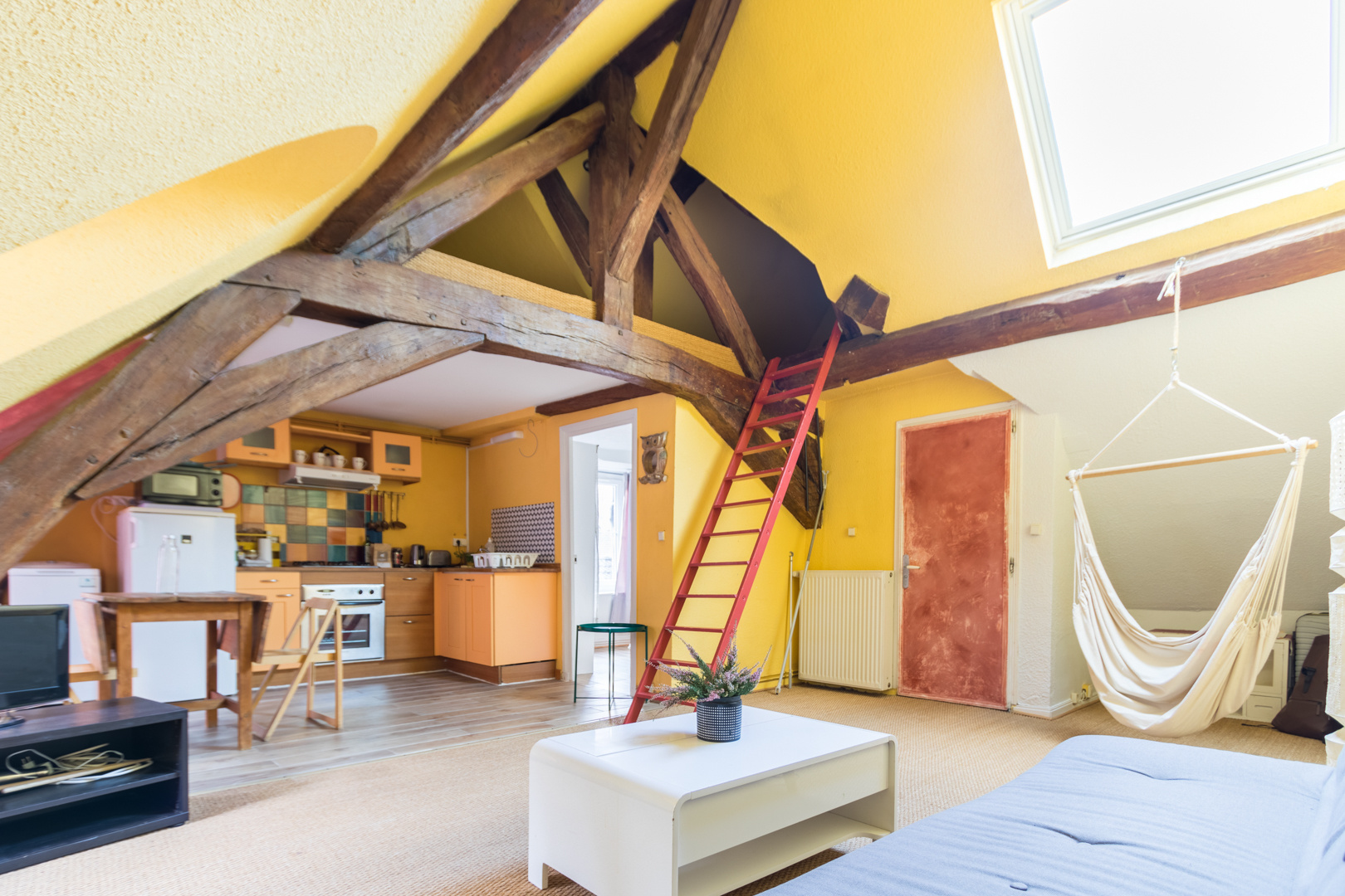 Bel appartement situé au 3ème et dernier étage d'un immeuble ancien comprenant cuisine équipée, salon, une chambre, un bureau, salle d'eau avec WC et espace chaufferie, cave.