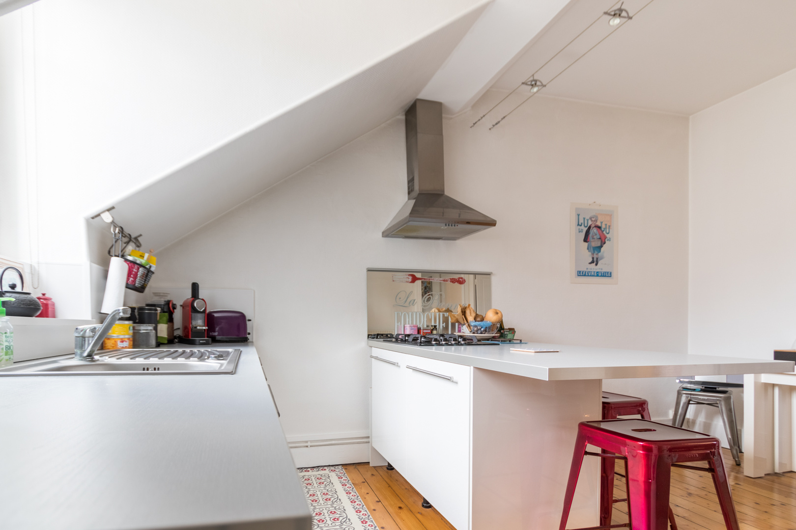 Idéalement placé rue Musette, appartement situé au deuxième et dernier étage comprenant séjour cathédrale avec cuisine ouverte donnant sur un joli extérieur privatif. Chambre séparée ainsi qu'une pièce d'appoint en mezzanine faisant office de bureau ...