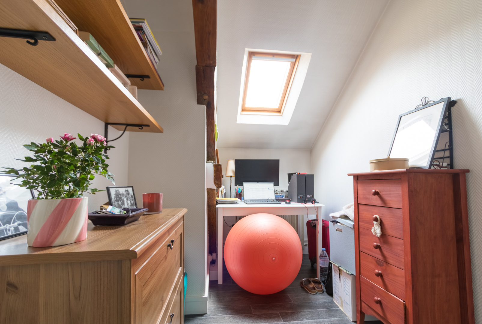 Duplex en dernier étage avec ascenseur dans une copropriété entretenue, comprenant séjour cathédrale avec mezzanine, cuisine séparée, deux chambres et un bureau.