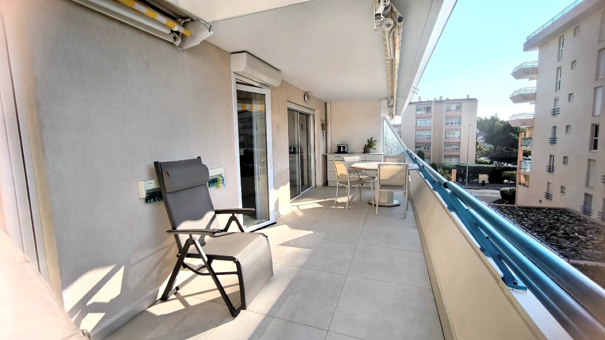 FREJUS PLAGE Proche mer et commerces , dans résidence de standing sécurisée avec piscine, appartement rénover aux prestations de qualité, en étage avec ascenseur, il se compose d'une entrée avec placard, cuisine ouverte sur séjour donnant sur une belle te...
