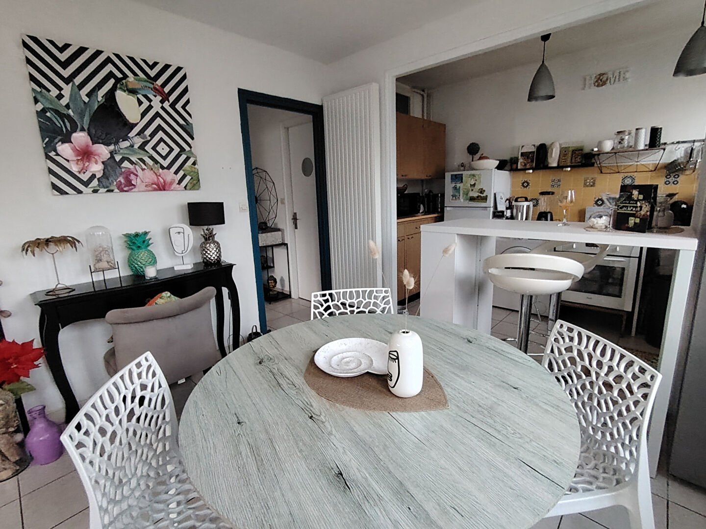 Pièce de vie ouverte sur une cuisine aménagée et équipée et une grande terrasse. Chambre, salle d'eau, wc.