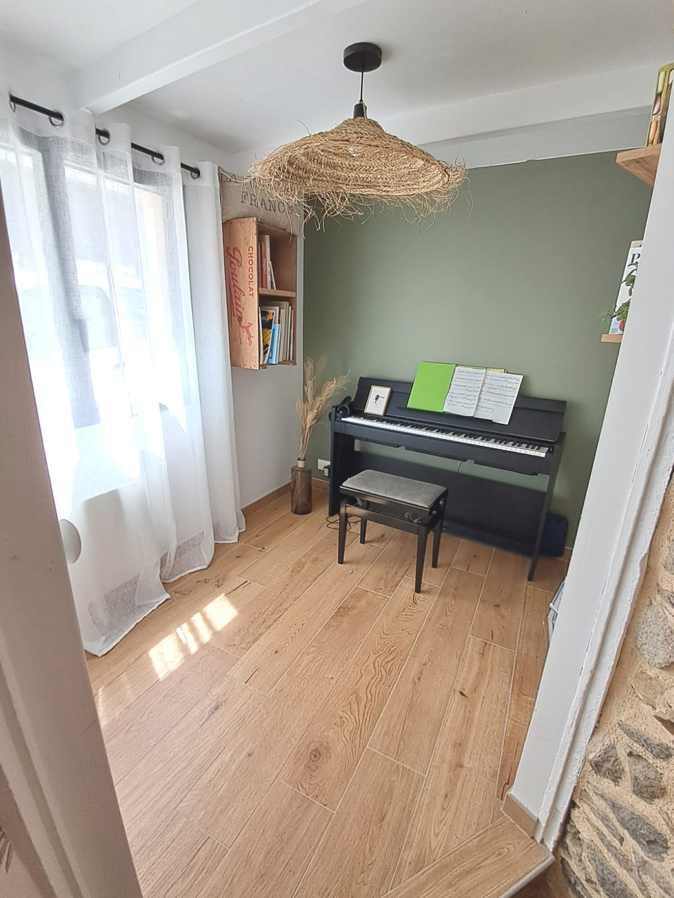 - Au rez-de-chaussée : Une pièce de vie avec cuisine aménagée, espace salon, cellier et wc.