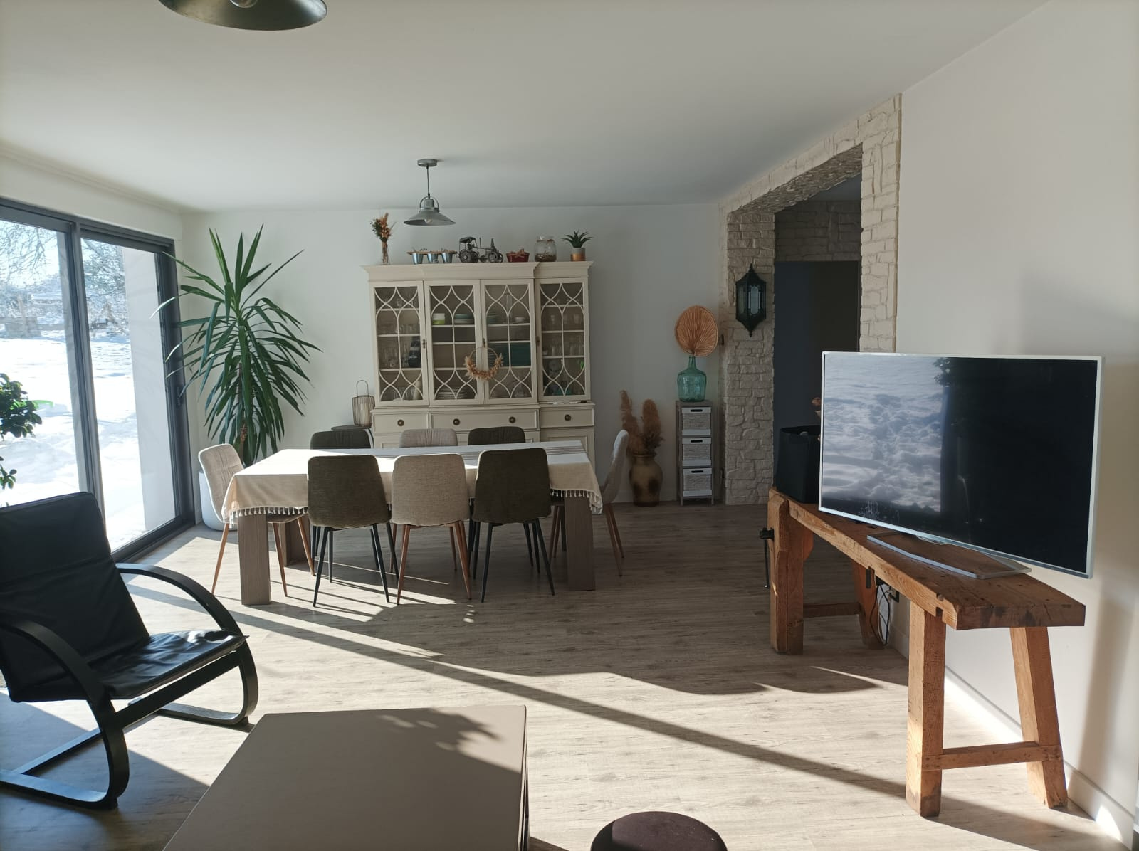 À vendre maison de plain-pied sur sous-sol, située à Vendrennes, offrant 118 m2 habitables sur un terrain de 2 110 m2. Elle se compose d'un salon-séjour avec extension, cuisine aménagée et équipée, 3 chambres, salle d'eau et WC séparés.