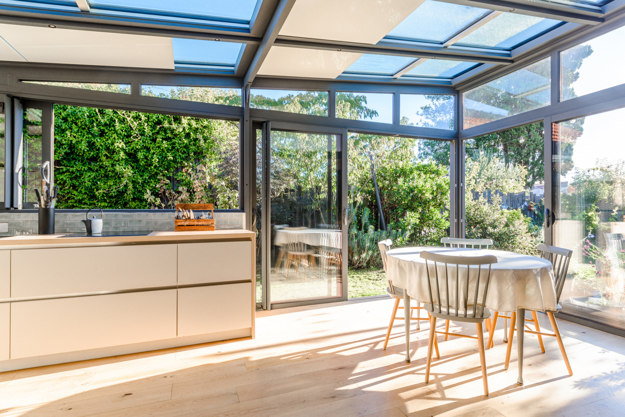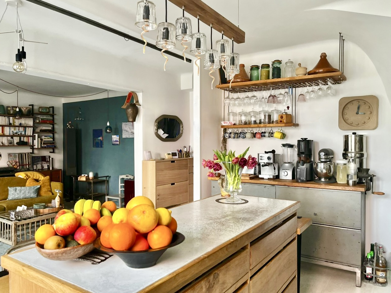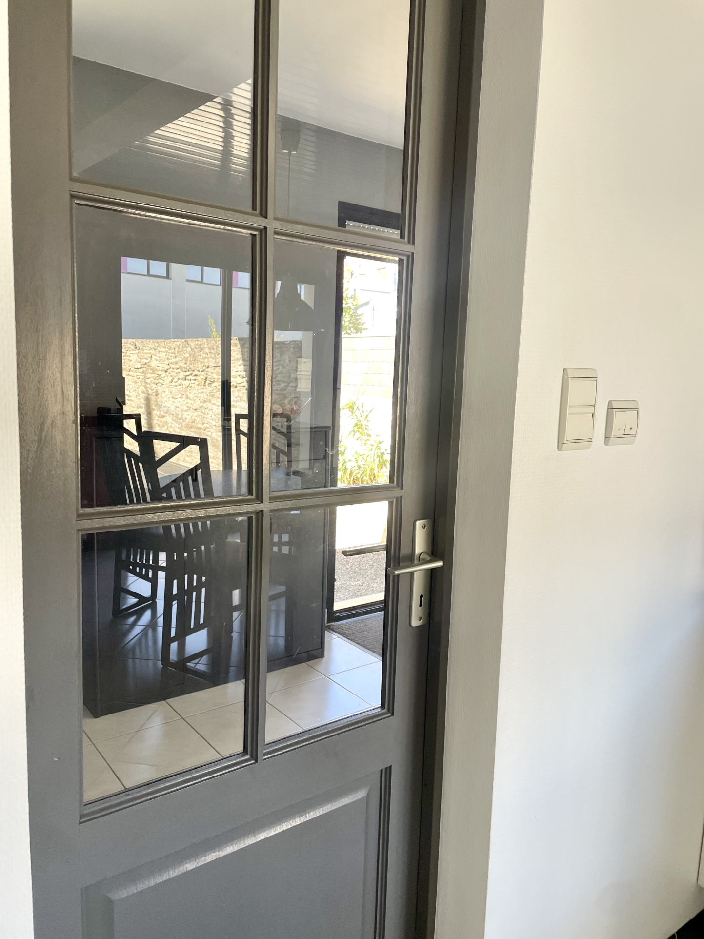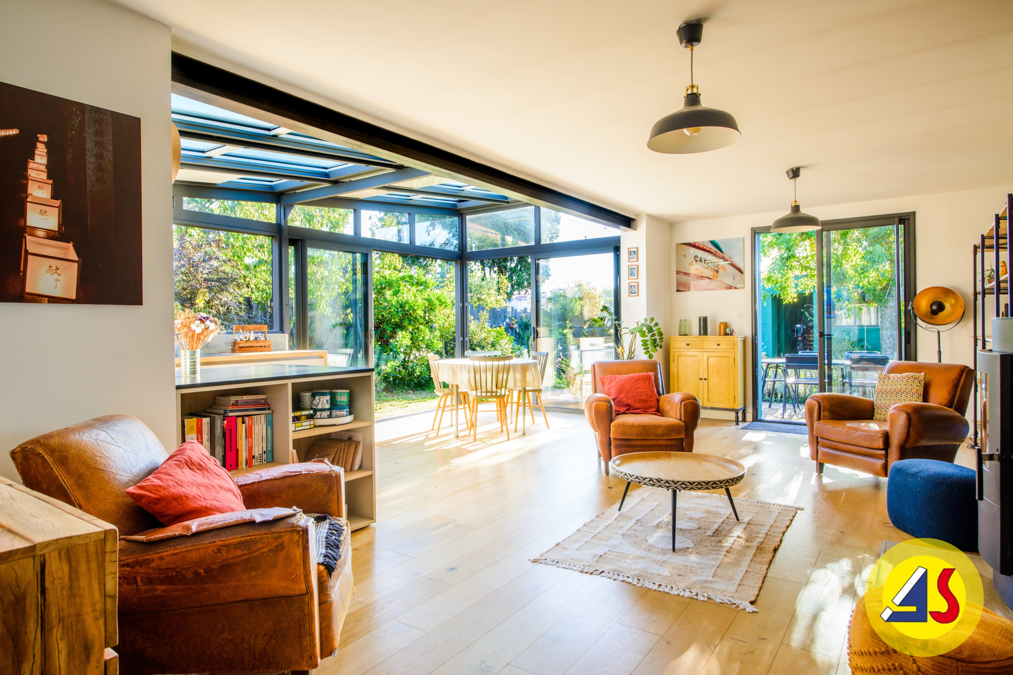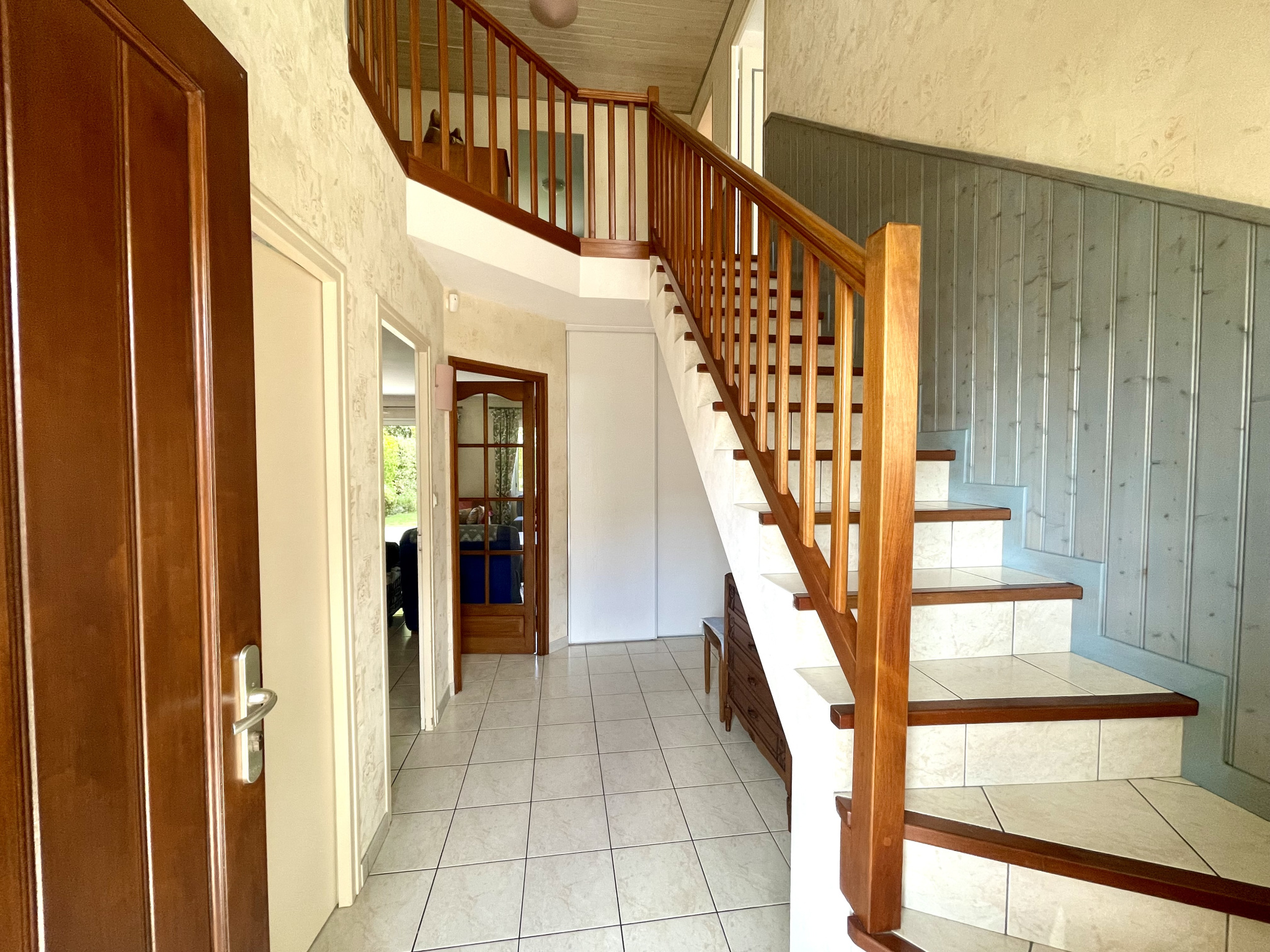 Grand hall lumineux menant à séjour baigné de lumière avec cheminée, accès cuisine séparée par dou...