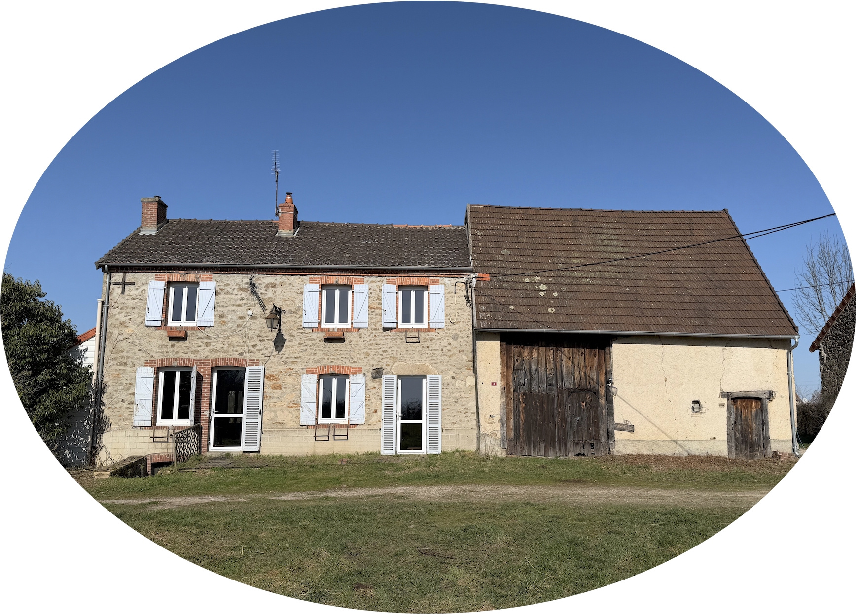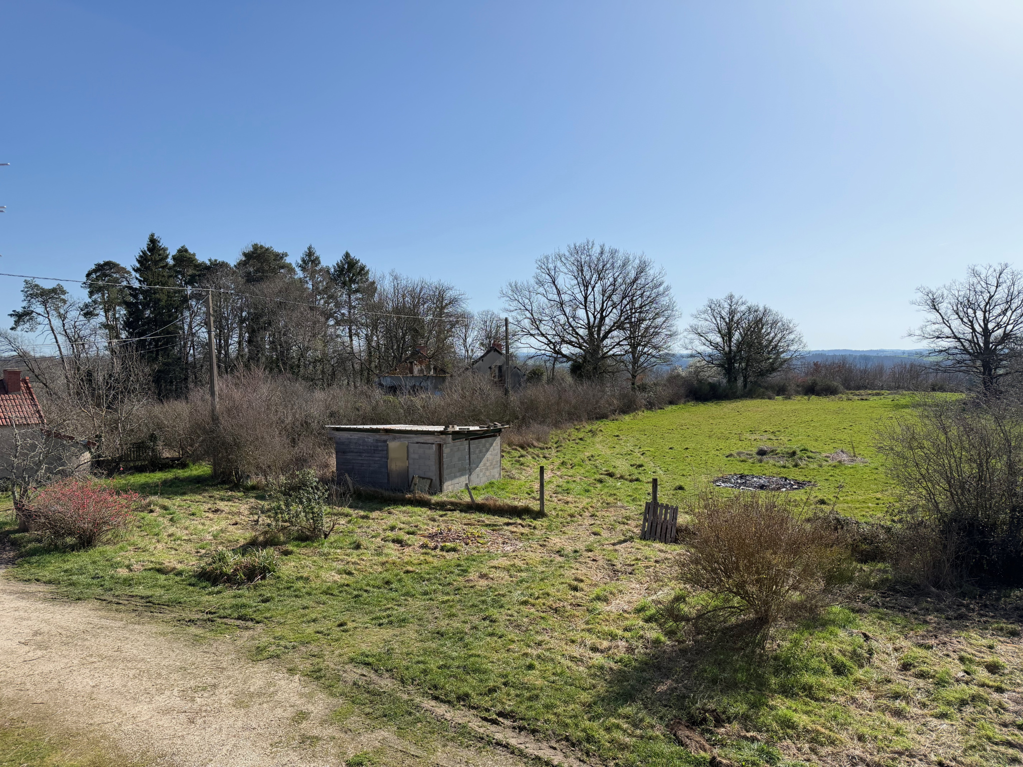 Auv 1202 : Maison partiellement rénovée, granges, 3970m2, belle vue. Cette propriété comprend une maison avec grange attenante et une seconde grange indépendante, situées sur un terrain légèrement en pente offrant une belle vue dégagée sur la campagne environn...